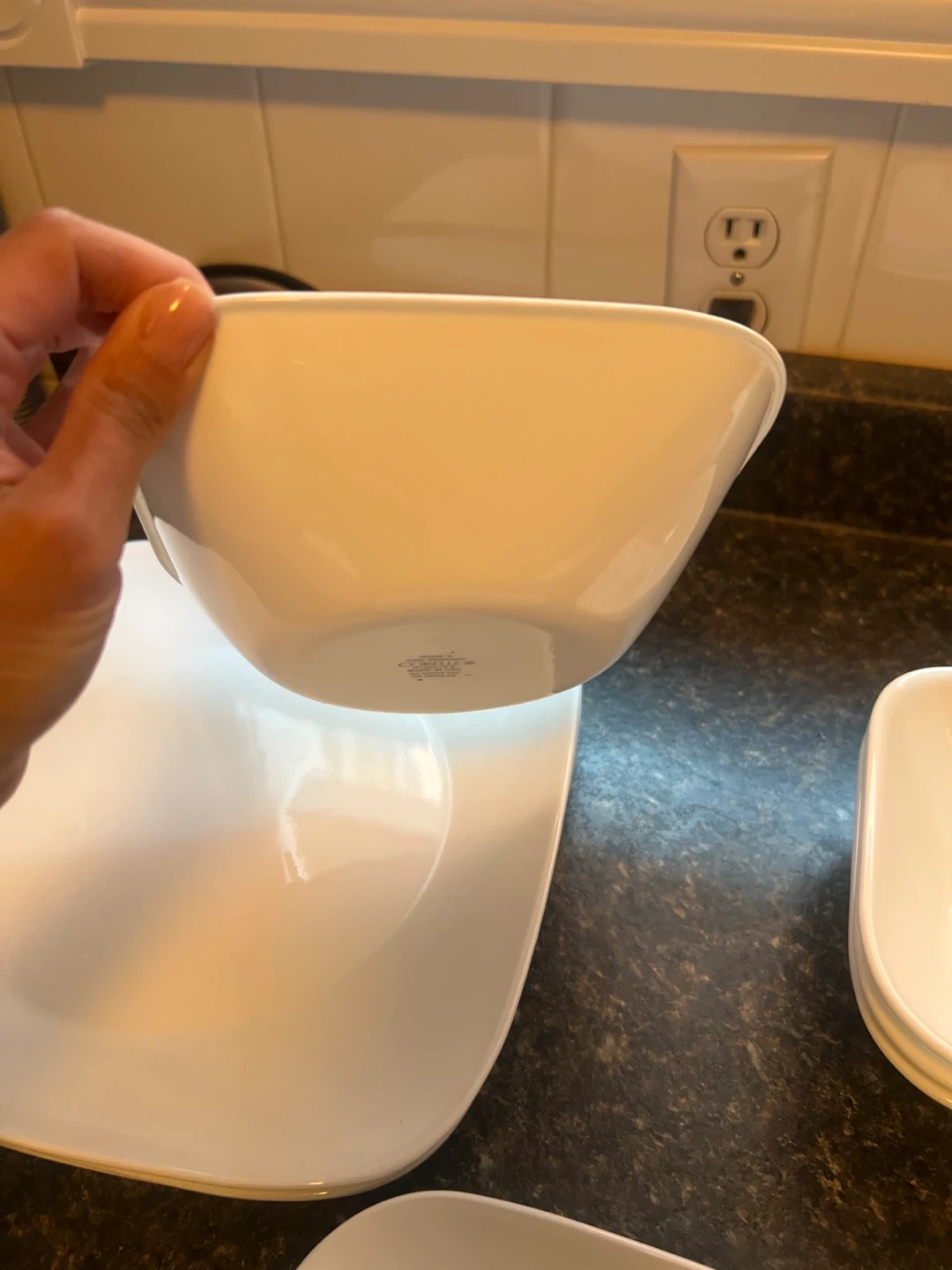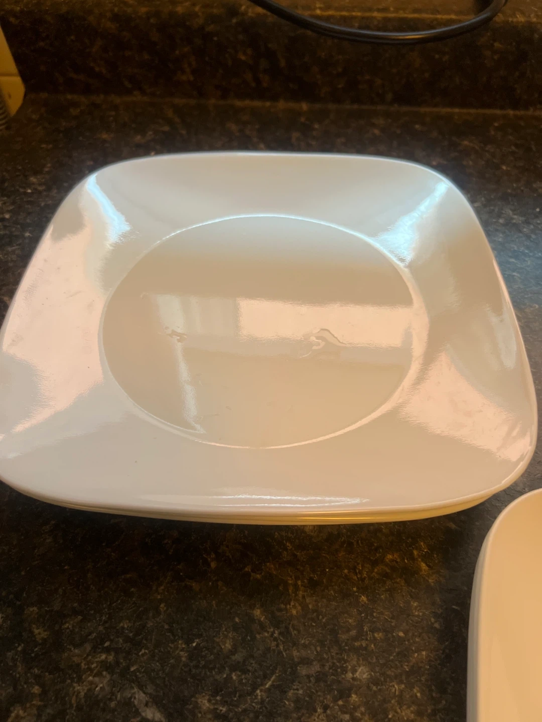 This set includes white square dinner plates and matching bowls. They're made of durable material and are perfect for everyday use. These dishes stack nicely for easy storage.