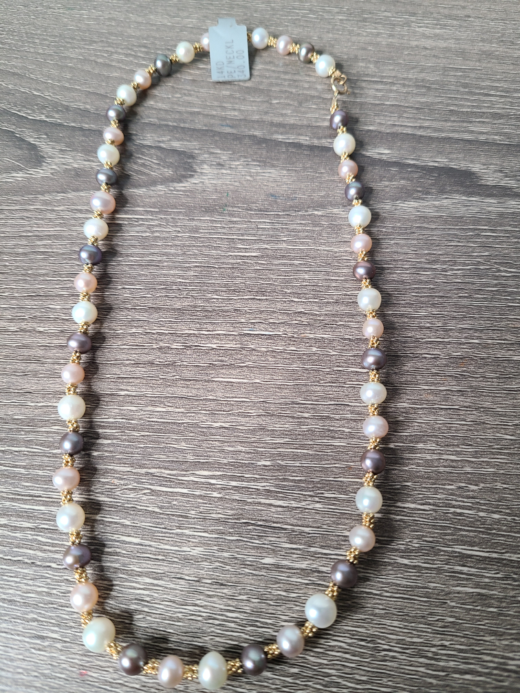 Beautiful multi-tone pearl necklace. This necklace is 16 inches long. Made for someone with a smaller neckline. White , Pink and Purple/Grey pearls. Original pricetage attached is $340 . Buy it now for only $225. Pickup is in Binbrook or shipping available at buyers expense.