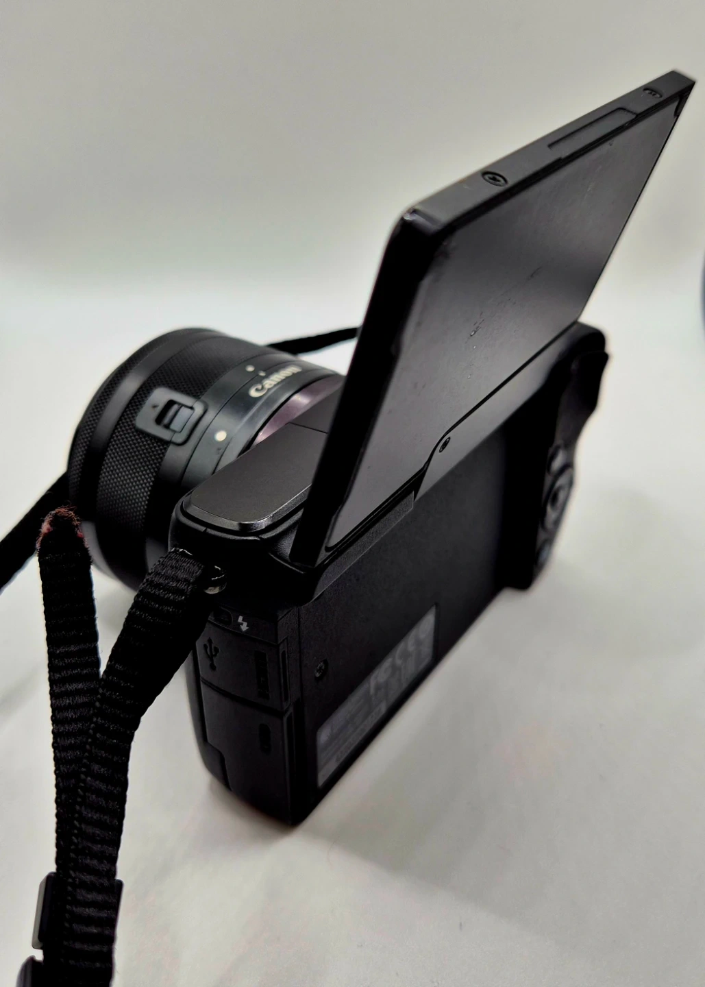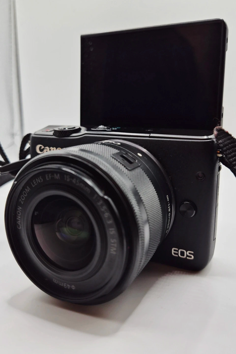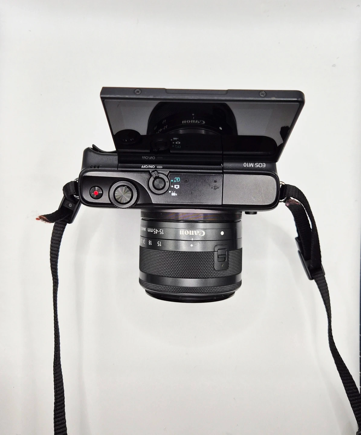 This is a black Canon EOS M10 mirrorless camera. It comes with a Canon ZOOM LENS EF-M 15-45mm 1:3.5-6.3 IS STM. The screen flips up, which is great for selfies and vlogging.