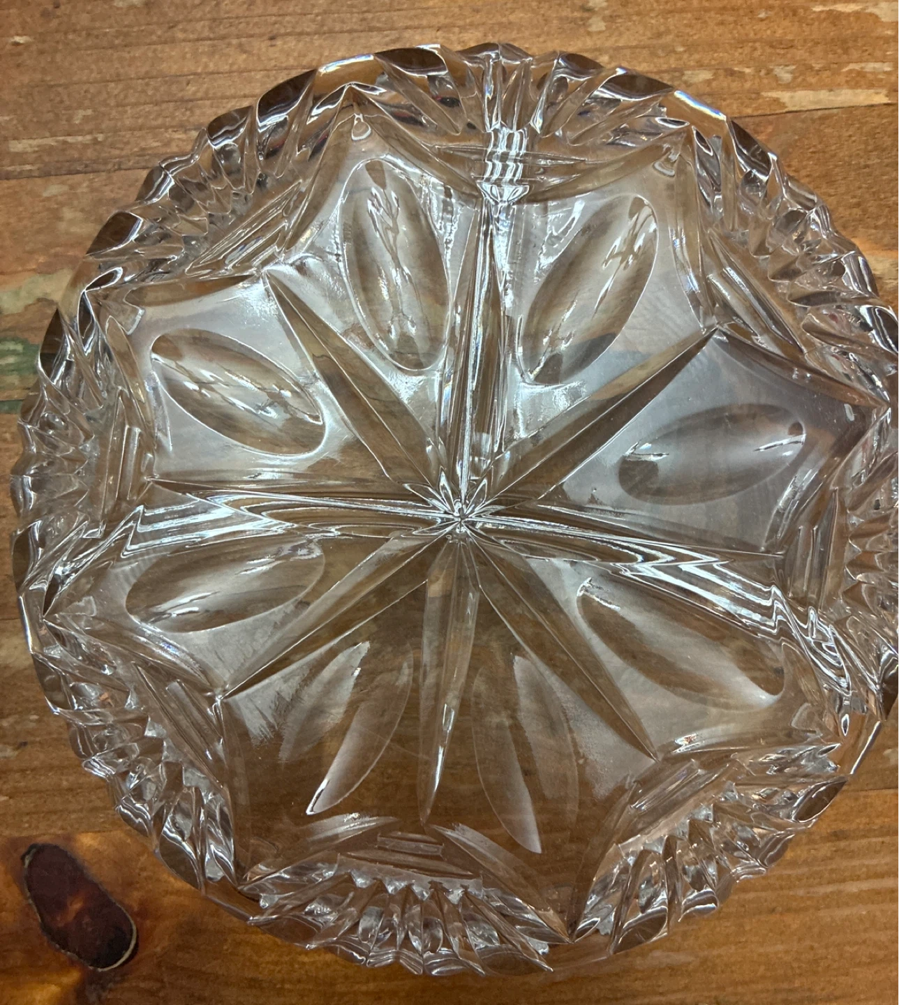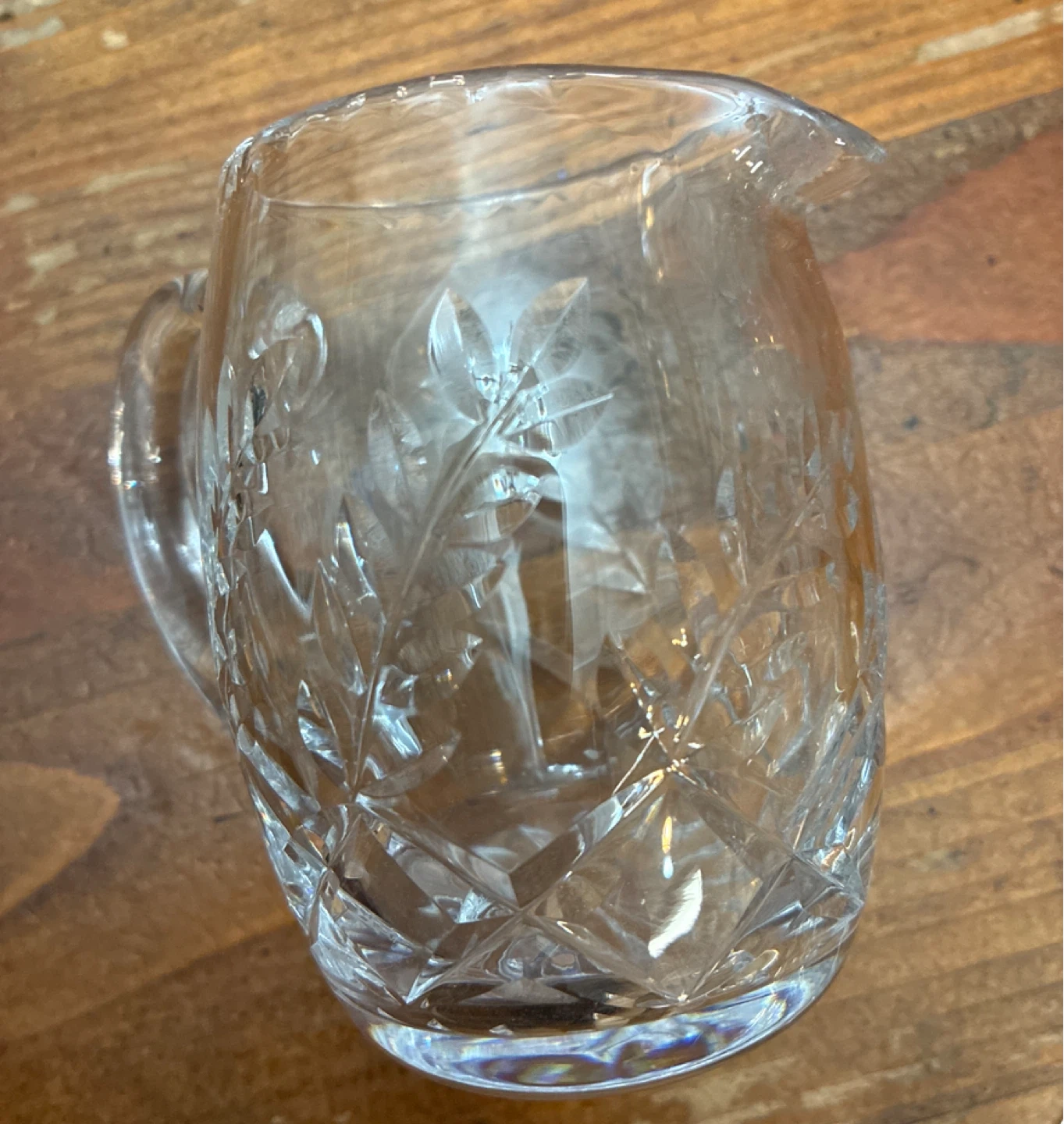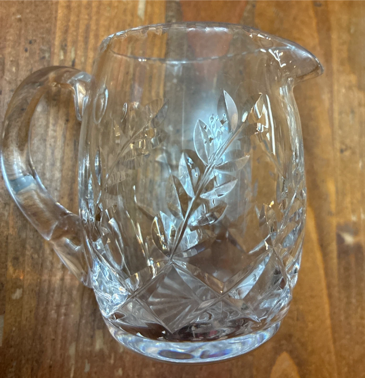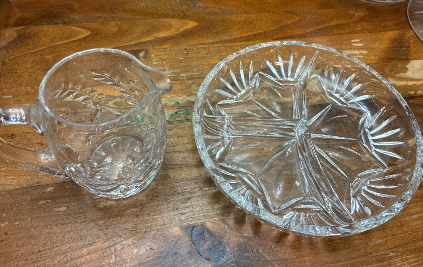 A beautiful crystal glass creamer pitcher with etched leaf design and a matching segmented relish dish. Both pieces have intricate cut glass patterns. Perfect for serving condiments or sauces.
