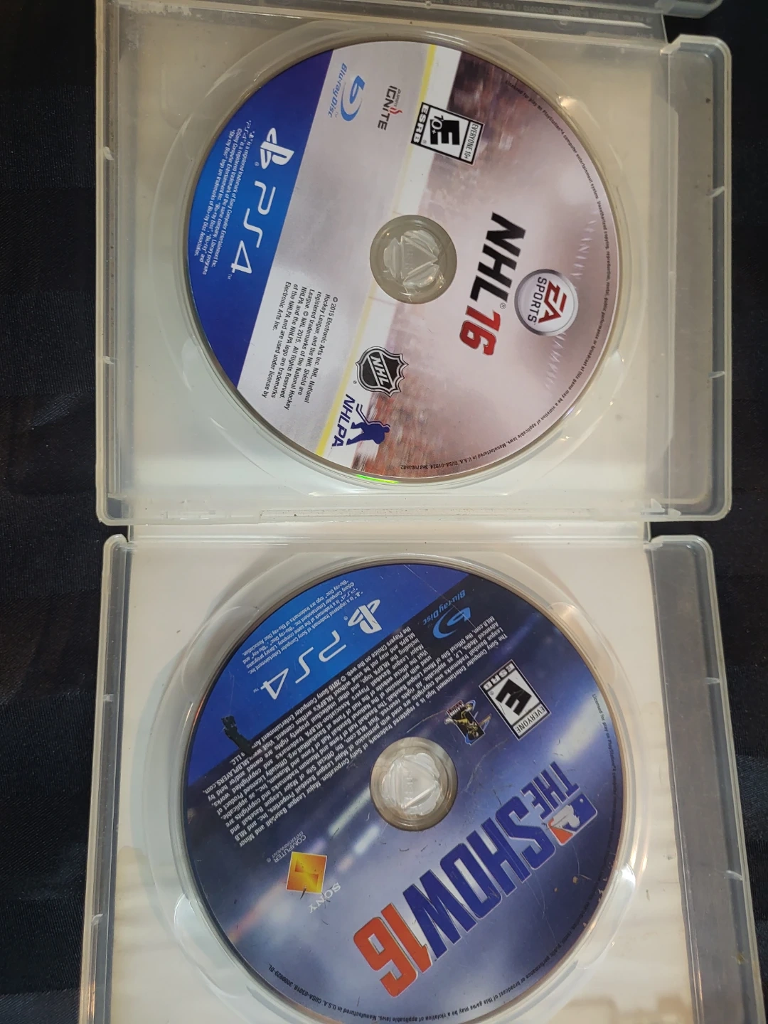 NHL 16 for PS4 by EA Sports. The Show 16 for PS4 by Sony Computer Entertainment. Both games are Blu-ray Disc format.