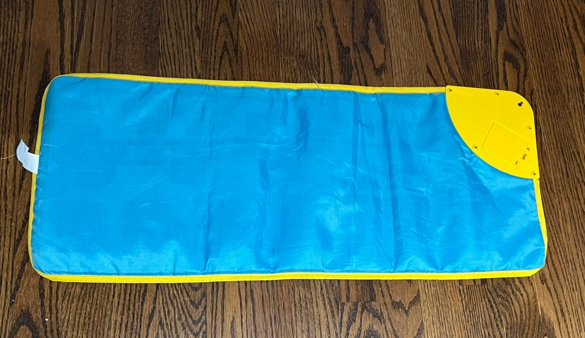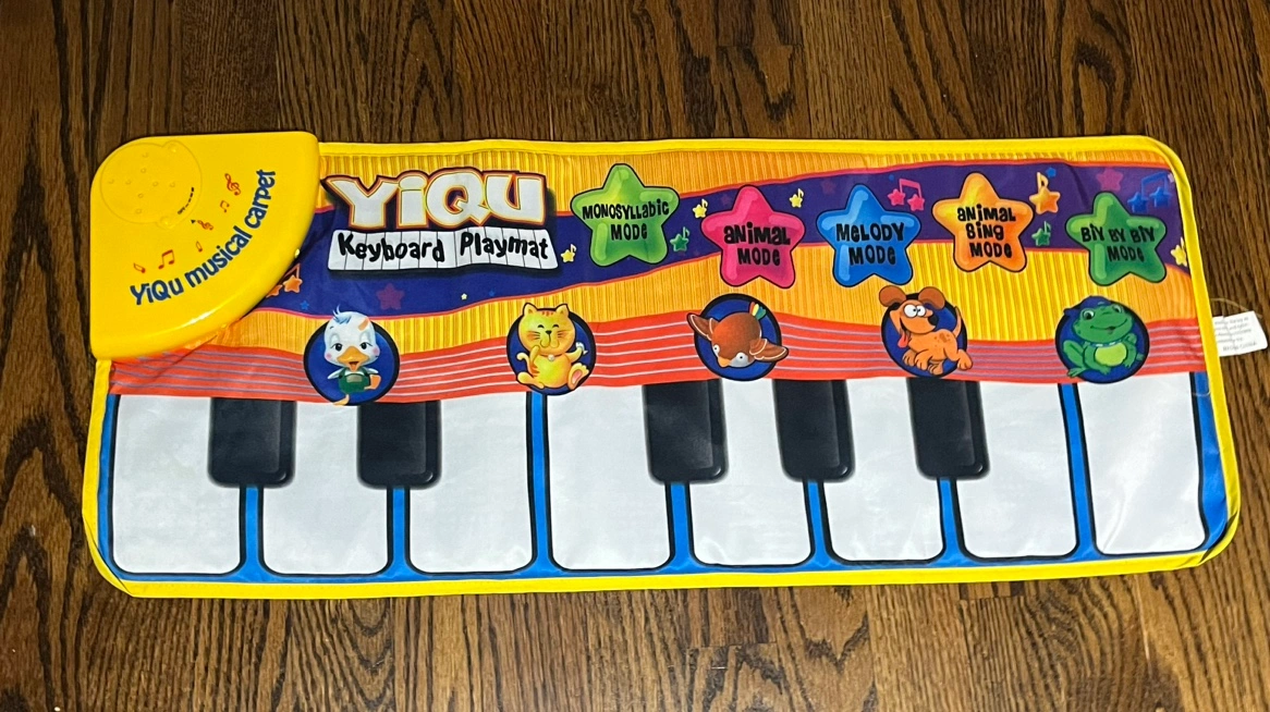 This is a musical keyboard playmat that plays music and sounds. It has different modes including animal, melody, and monosyllabic. The mat folds in half to be more compact for storage.