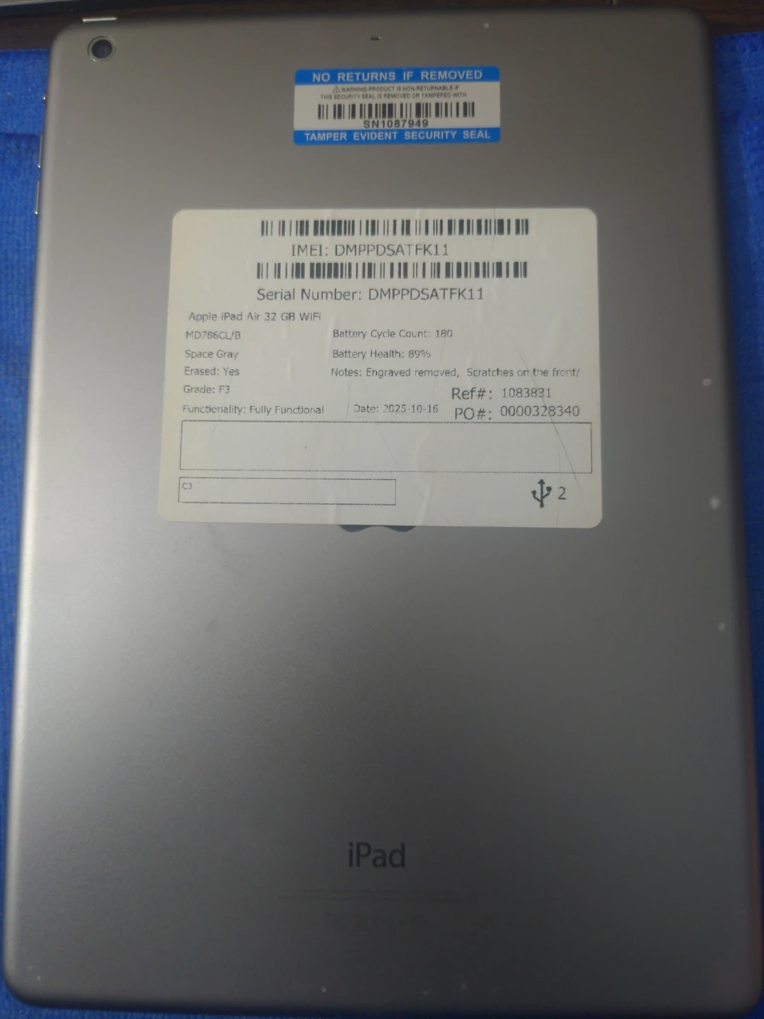 This is an Apple iPad Air with 32 GB of WiFi storage. It's a Space Gray model and is fully functional. The battery health is 89% with a cycle count of 180.