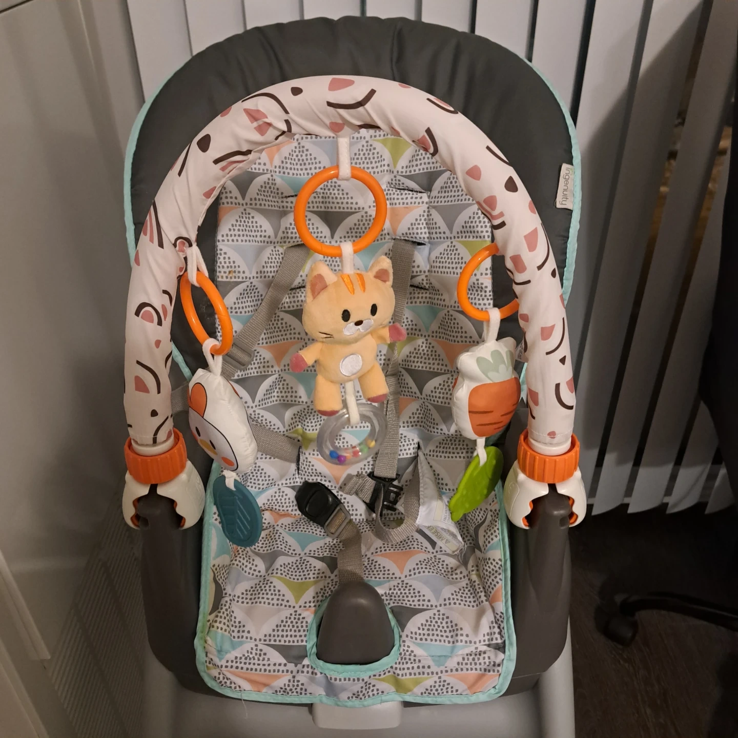 Selling a gently used TUMAMA Kids 2-in-1 Spiral Car Seat Toy! It's great for babies aged 0-6 months. This toy can be used in the car, on a stroller, or even on a crib or bassinet. It features adjustable clips and detachable sensory toys to keep your little one entertained on the go