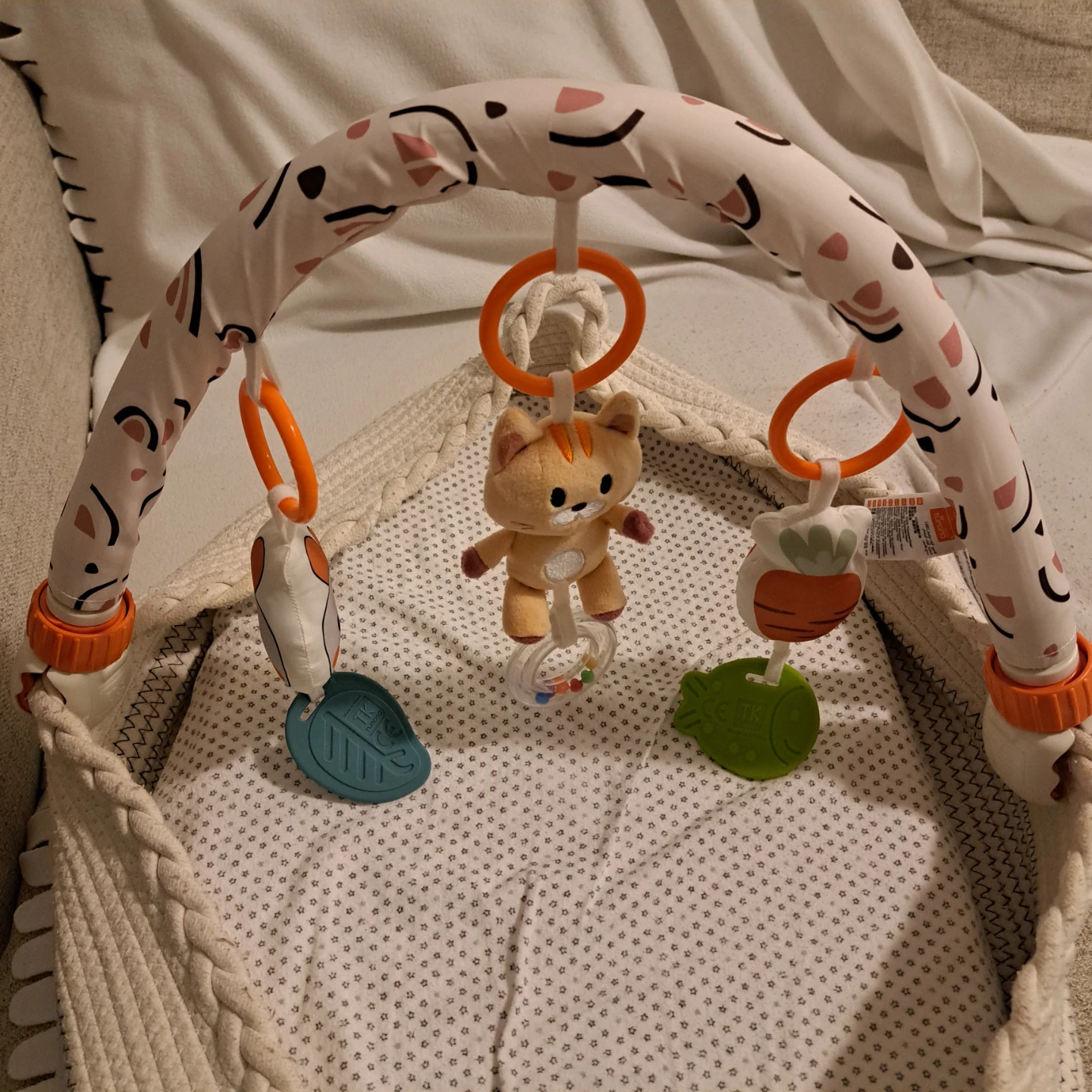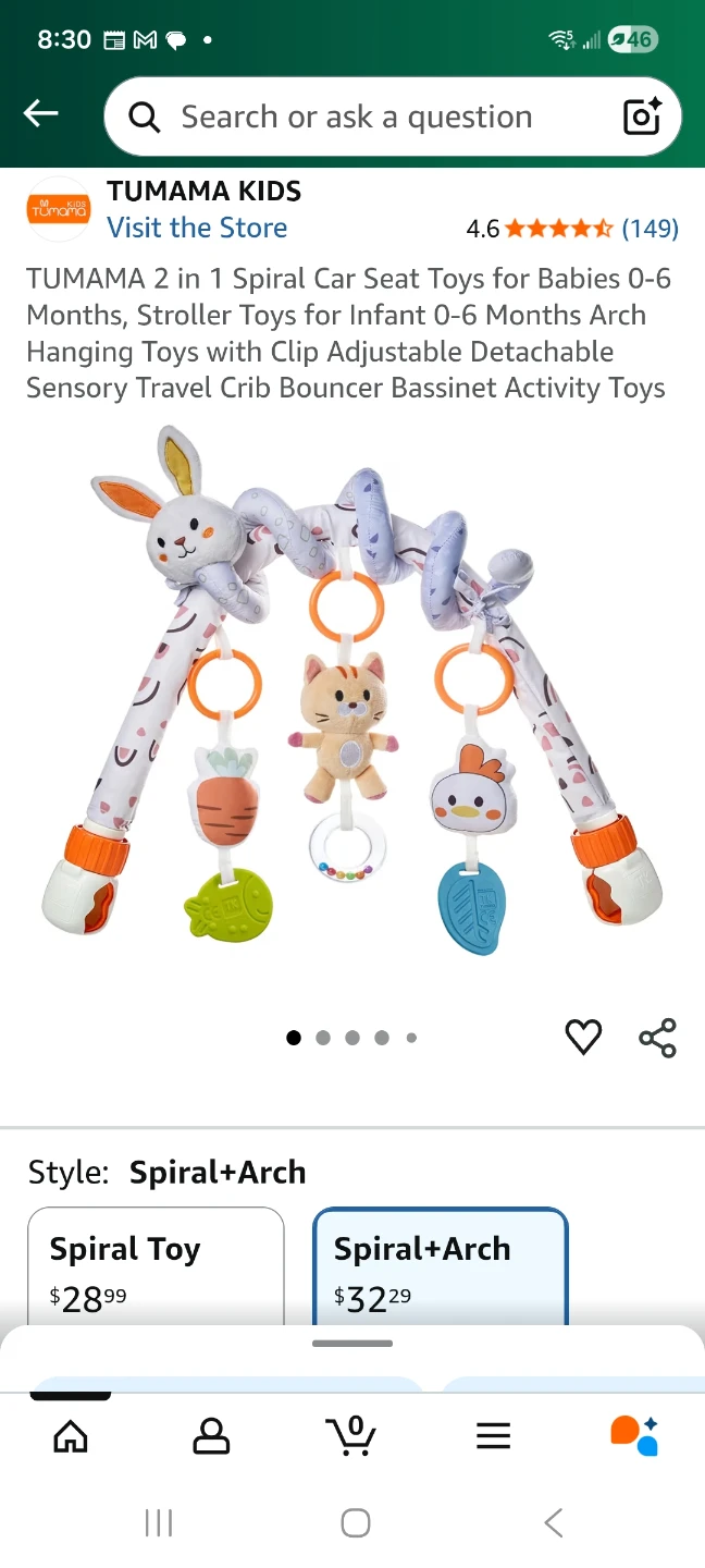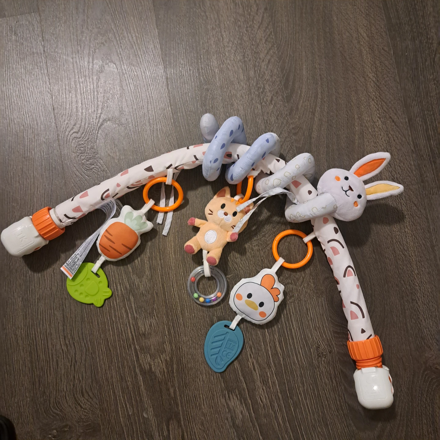 Selling a gently used TUMAMA Kids 2-in-1 Spiral Car Seat Toy! It's great for babies aged 0-6 months. This toy can be used in the car, on a stroller, or even on a crib or bassinet. It features adjustable clips and detachable sensory toys to keep your little one entertained on the go