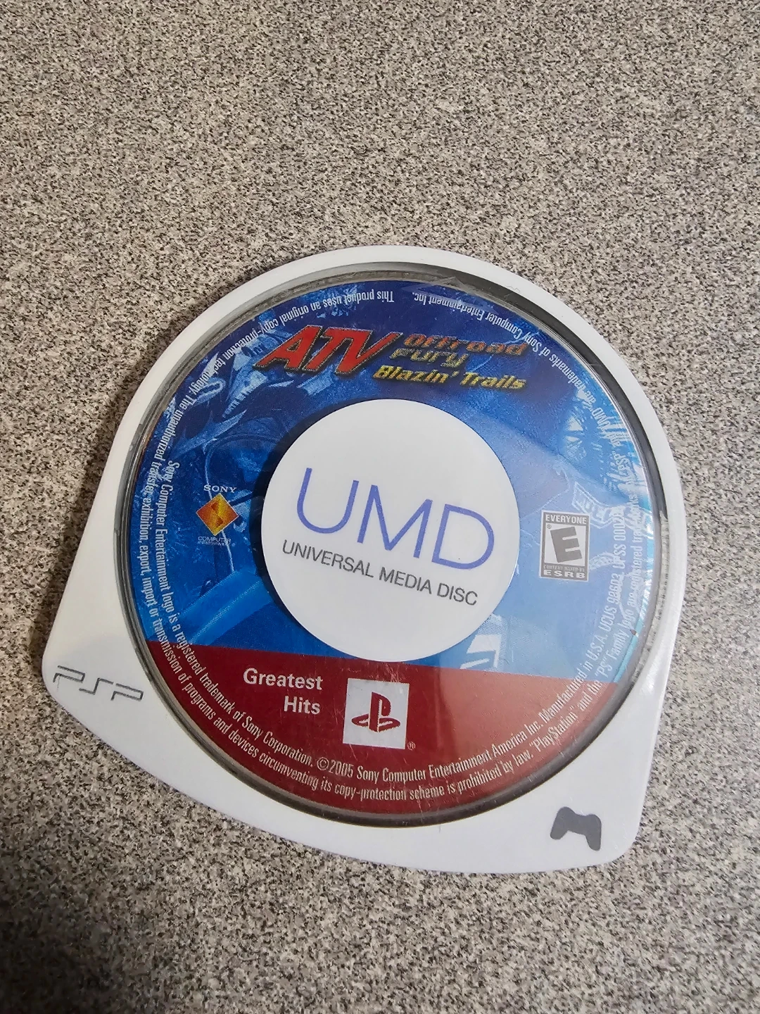 This UMD disc is for the PSP game ATV Offroad Fury: Blazin' Trails. It's part of the Greatest Hits collection. The disc is a Universal Media Disc.