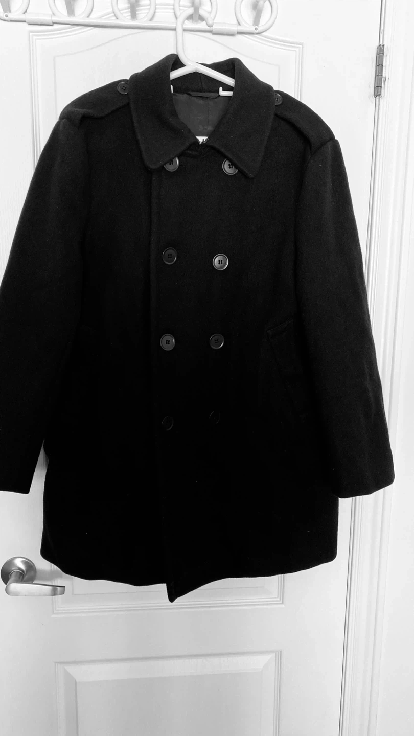 This black coat is double-breasted with a classic design. It's made of wool, offering warmth and durability. The coat features a notched lapel and button closure.
