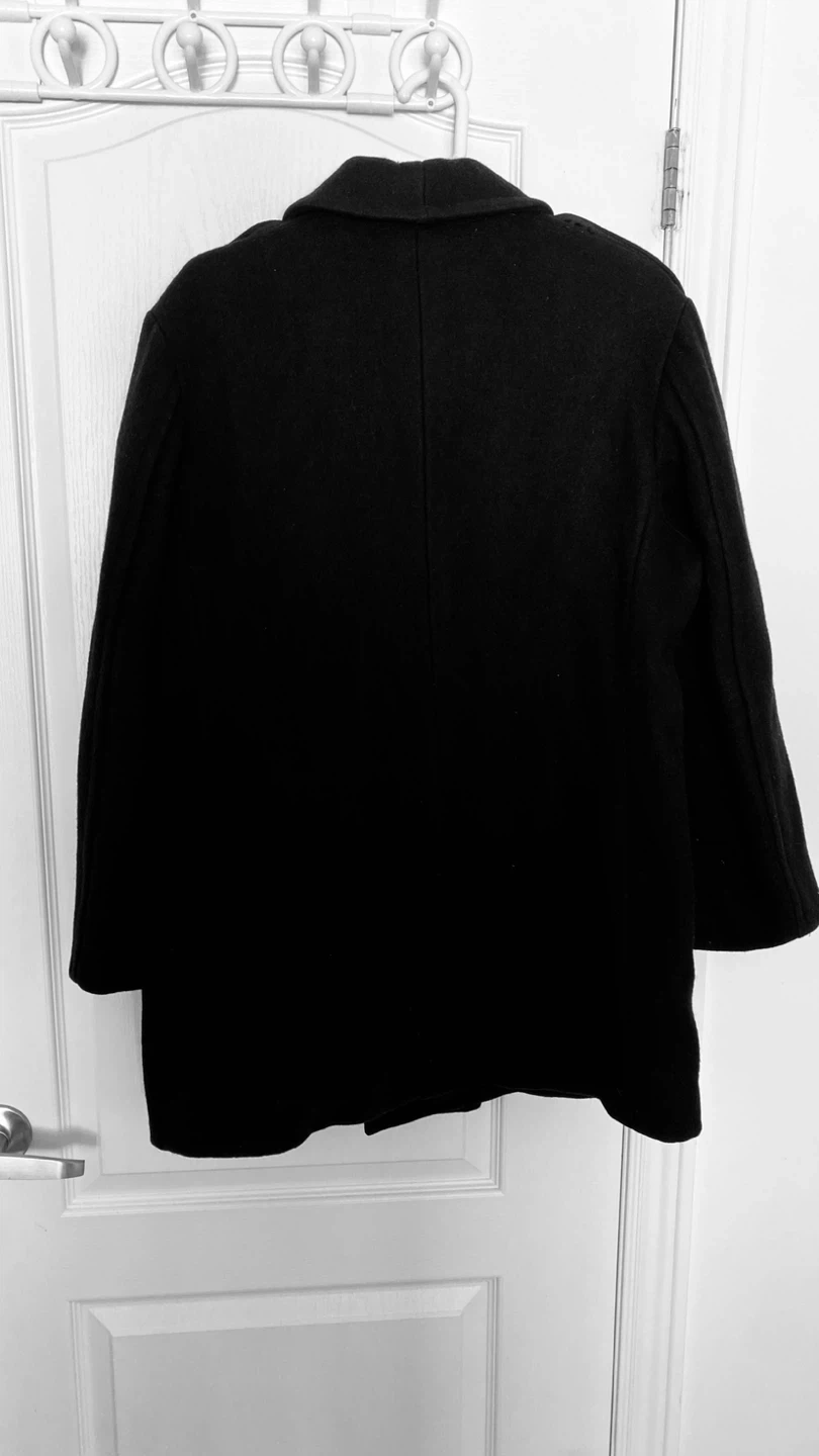 This black coat is double-breasted with a classic design. It's made of wool, offering warmth and durability. The coat features a notched lapel and button closure.