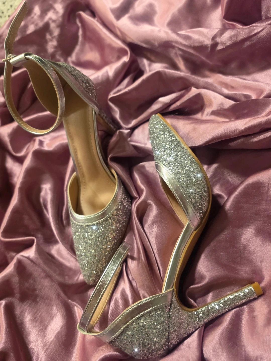 Sparkly silver glitter heels with an ankle strap. They feature a pointed toe and stiletto heel.