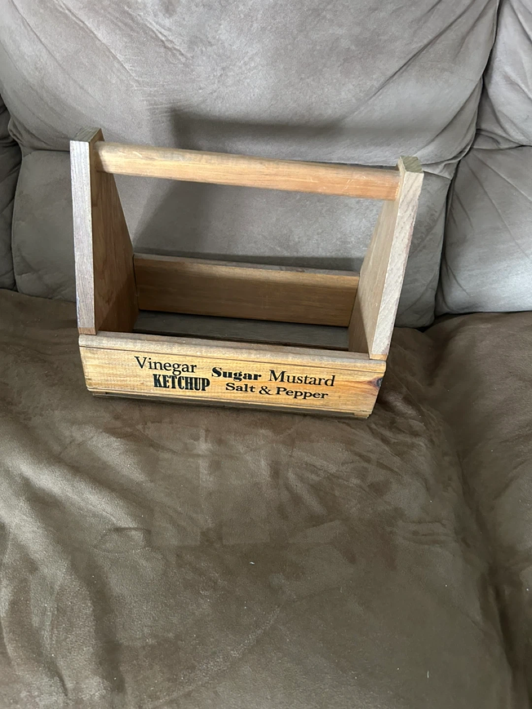 This wooden caddy features vintage Coca-Cola branding on one side. The other side is labelled for condiments like vinegar, sugar, mustard, ketchup, and salt & pepper. It's great for picnics or BBQs!