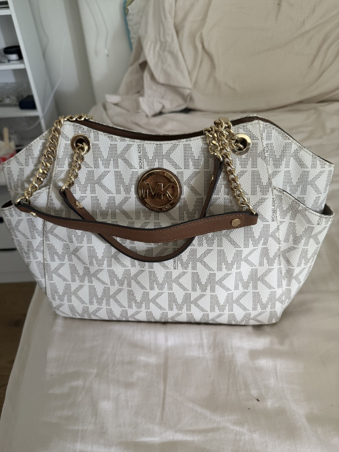 Selling a stylish Michael Kors tote bag! It features a white and grey MK logo print with brown trim and gold chain accents. Perfect for everyday use!