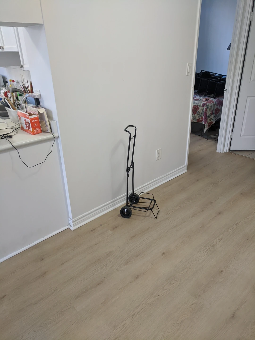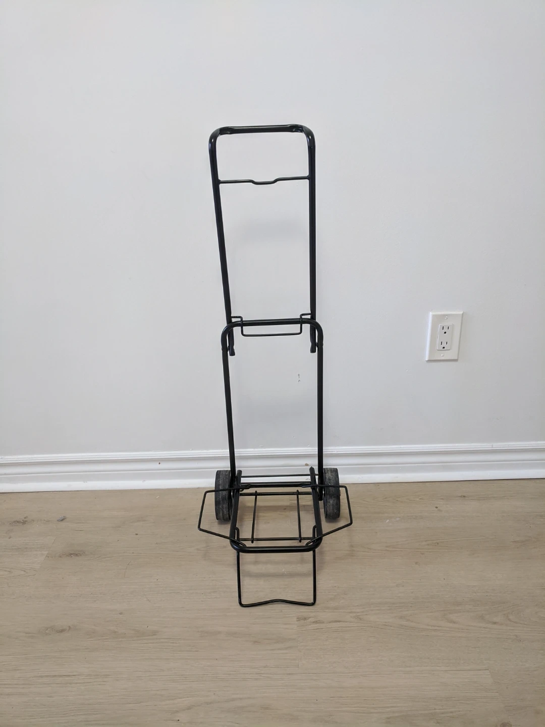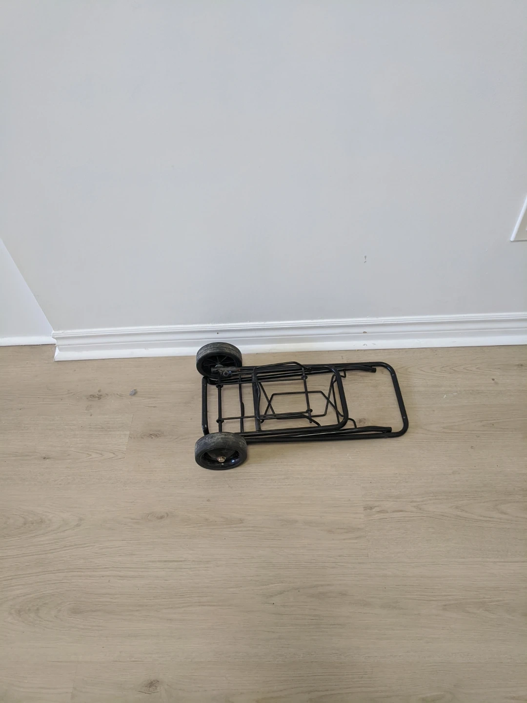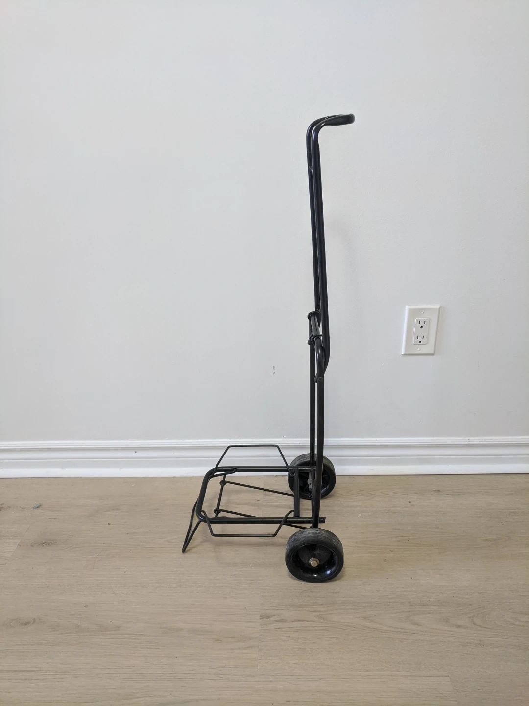 A black folding luggage cart with two wheels. It's great for carrying groceries or travel bags. It folds flat for easy storage. Pick up at 195 Merton Street Toronto or pick up at Subway station Davisivill. And I can deliver it to your house but you need to pay me another $3. Thanks.