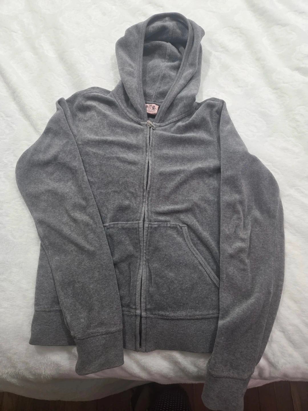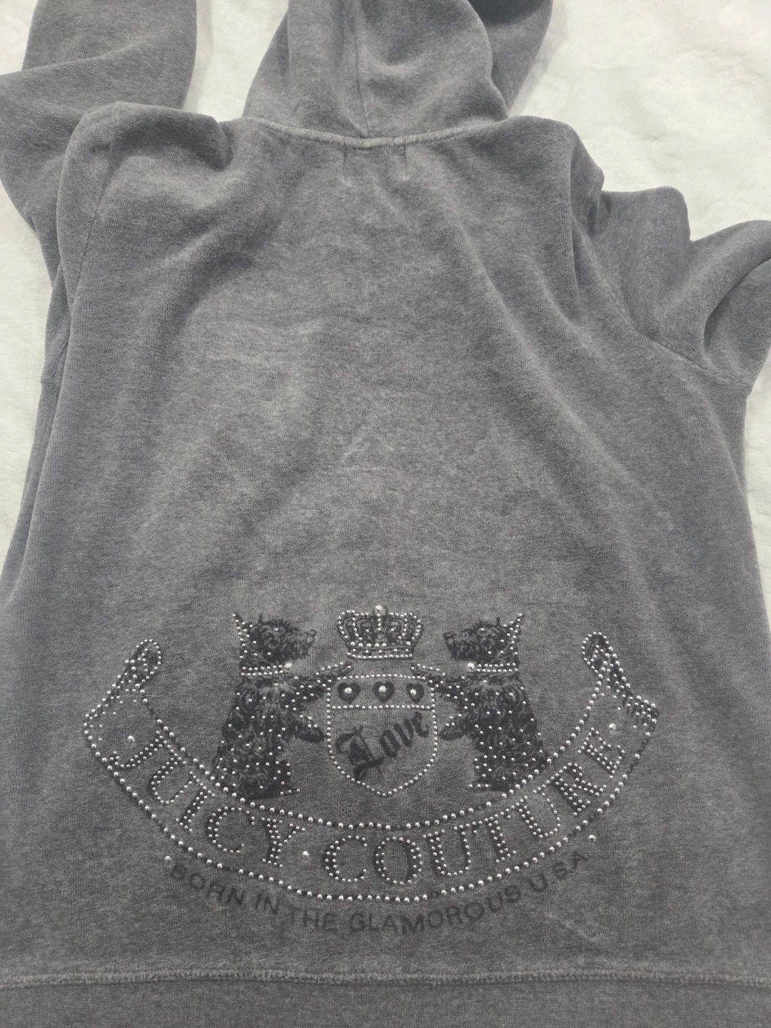 This is a grey Juicy Couture velour zip-up hoodie. It features the iconic Juicy Couture crest logo with rhinestones on the back. Size is small.