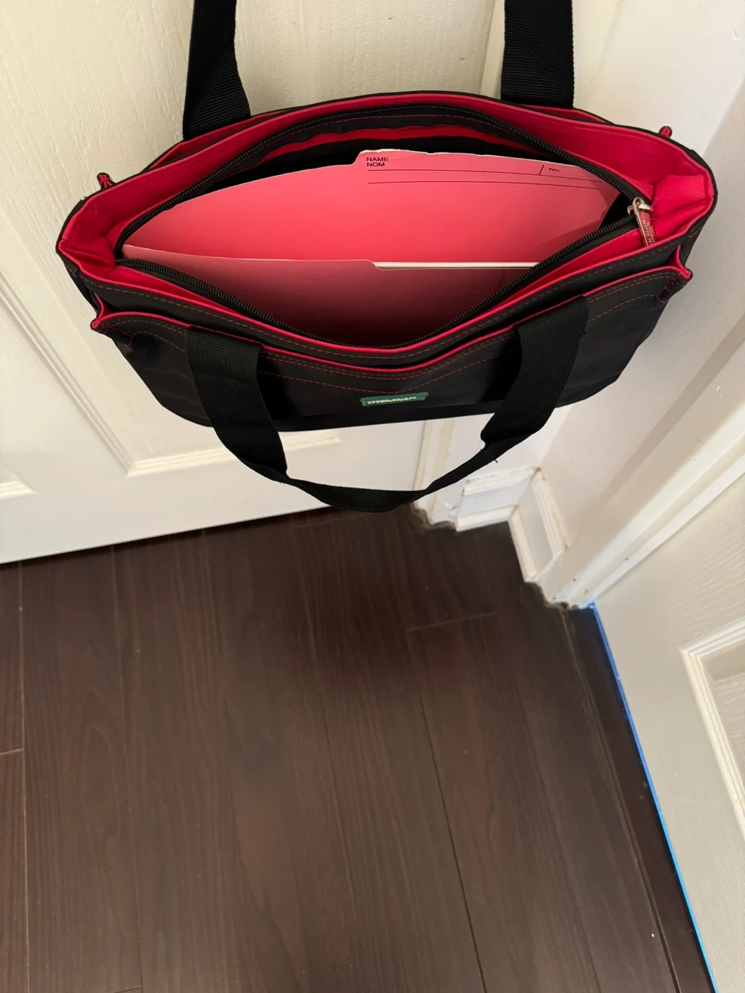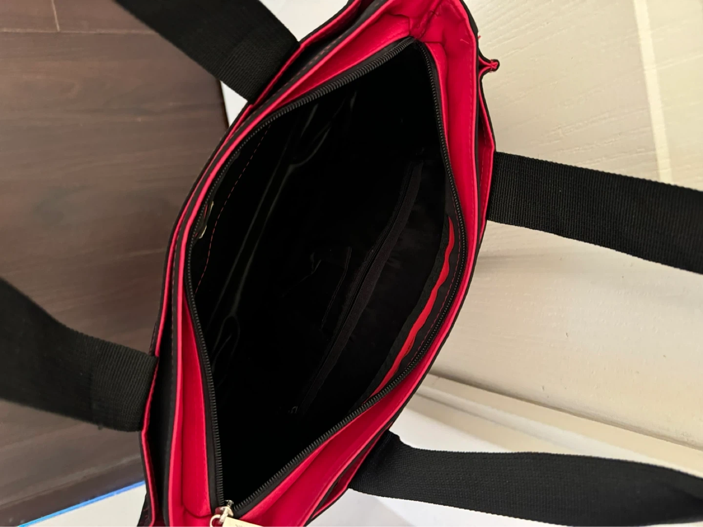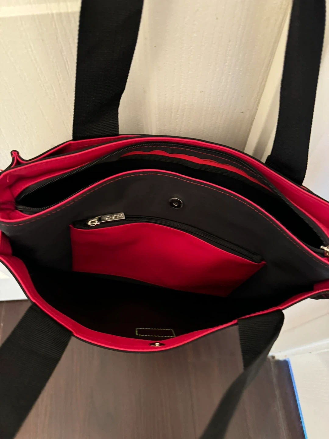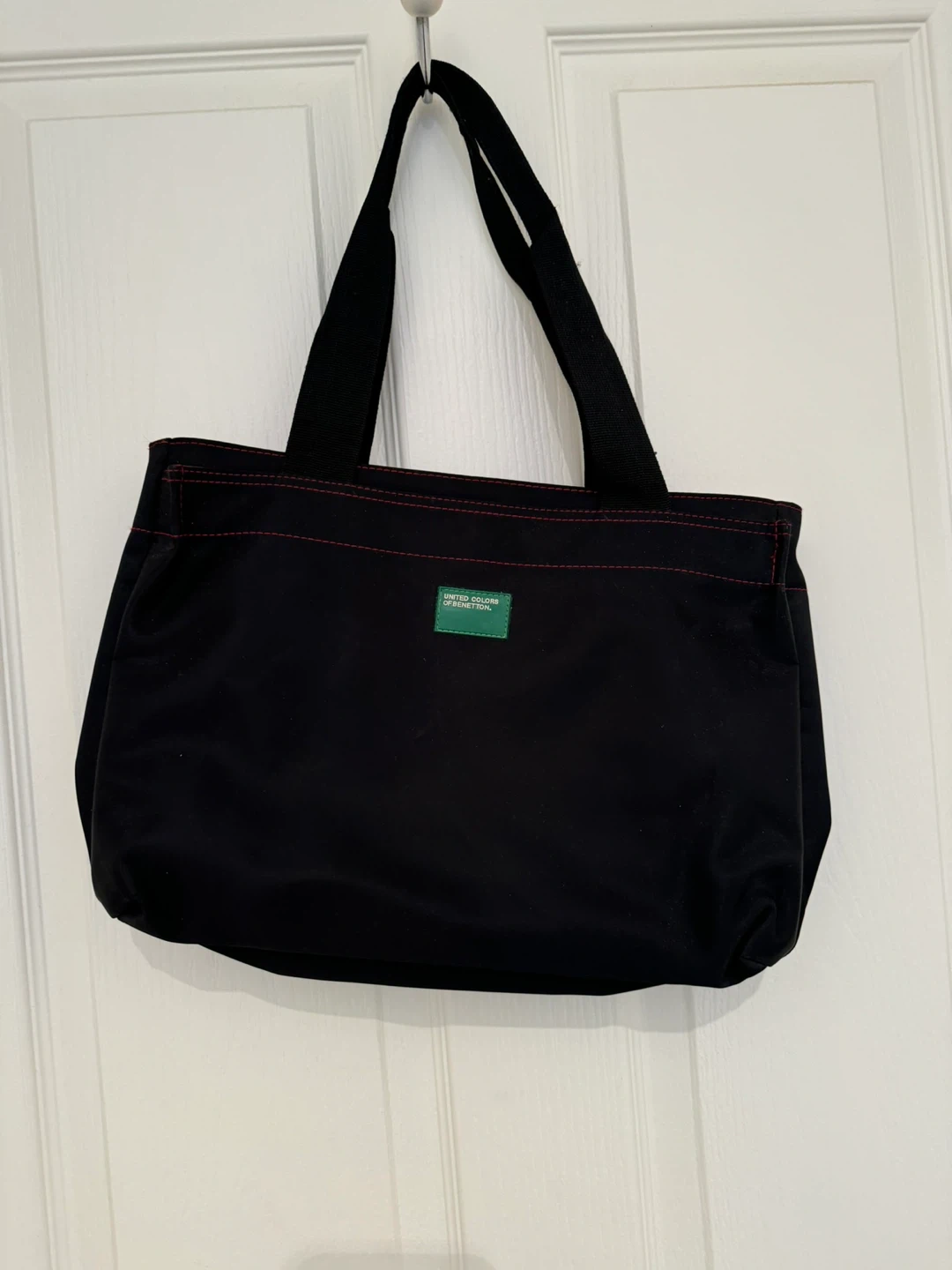 This black tote bag features a vibrant red interior and black straps. It has multiple zippered compartments for organization. Made by United Colors of Benetton.