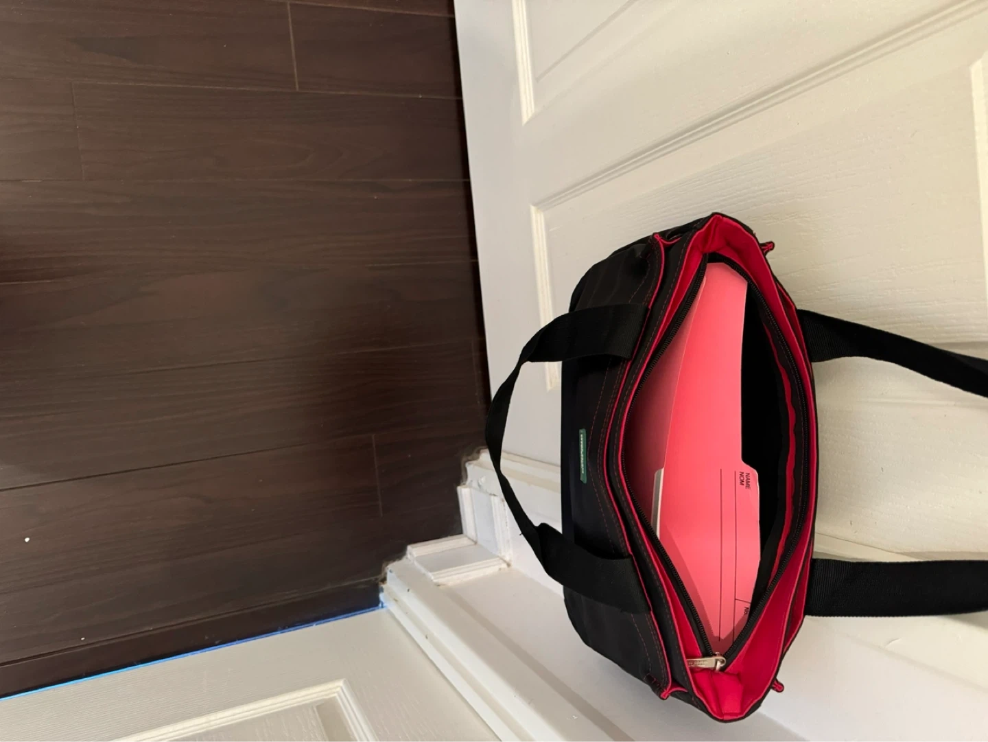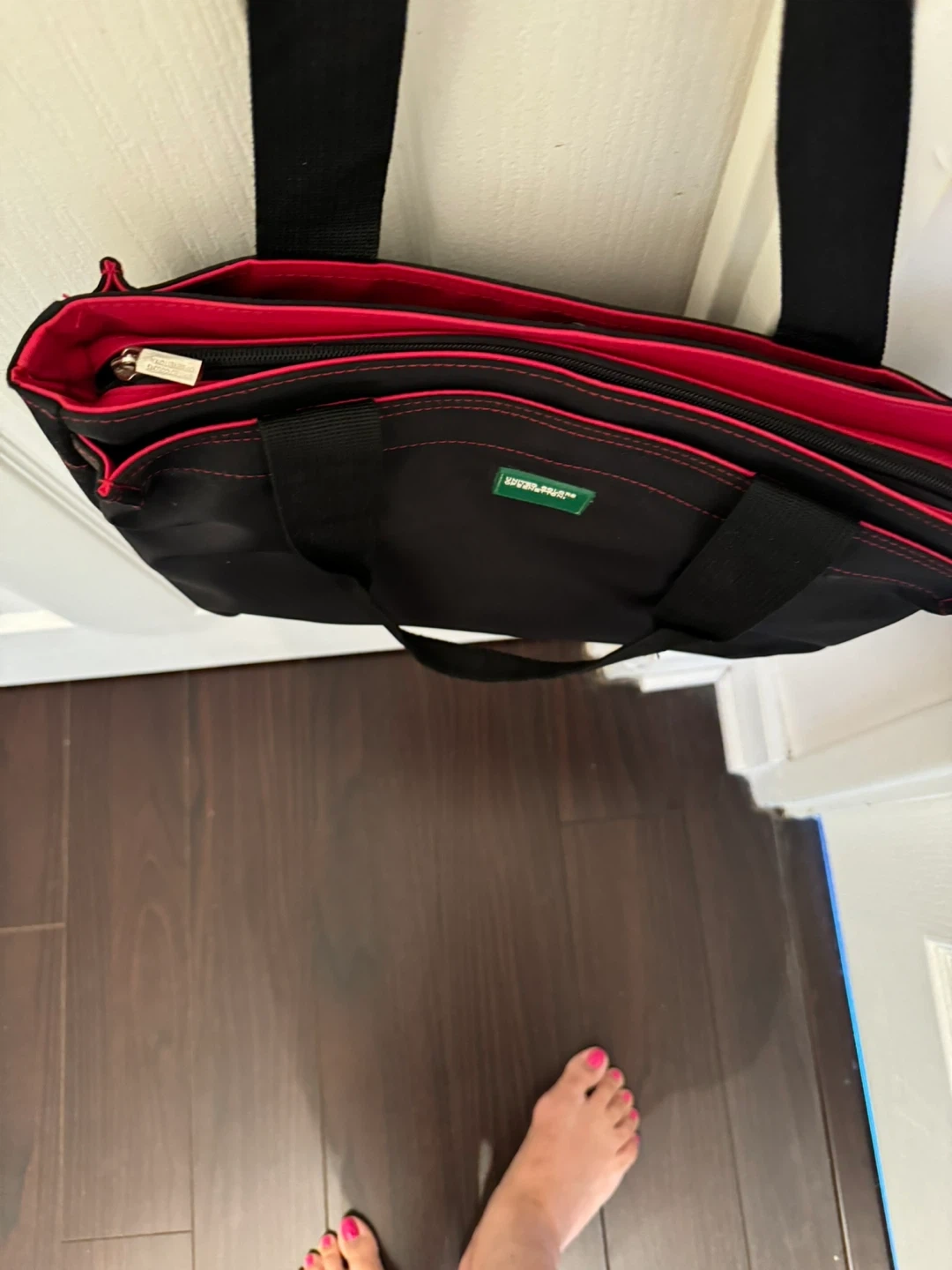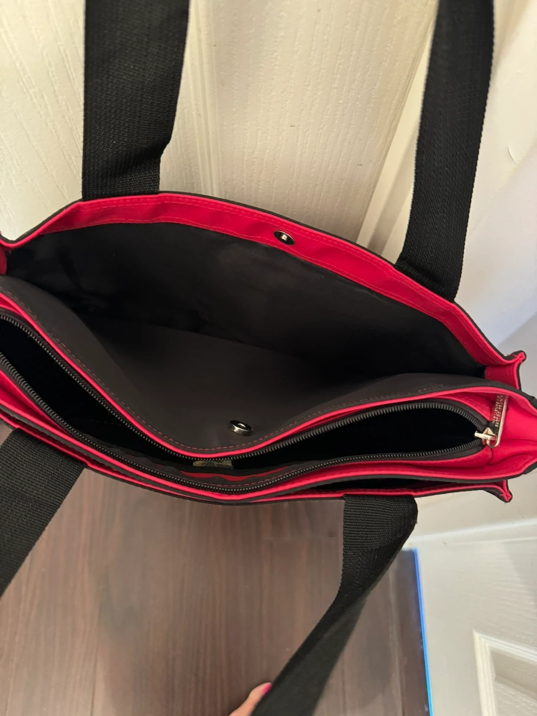 This black tote bag features a vibrant red interior and black straps. It has multiple zippered compartments for organization. Made by United Colors of Benetton.