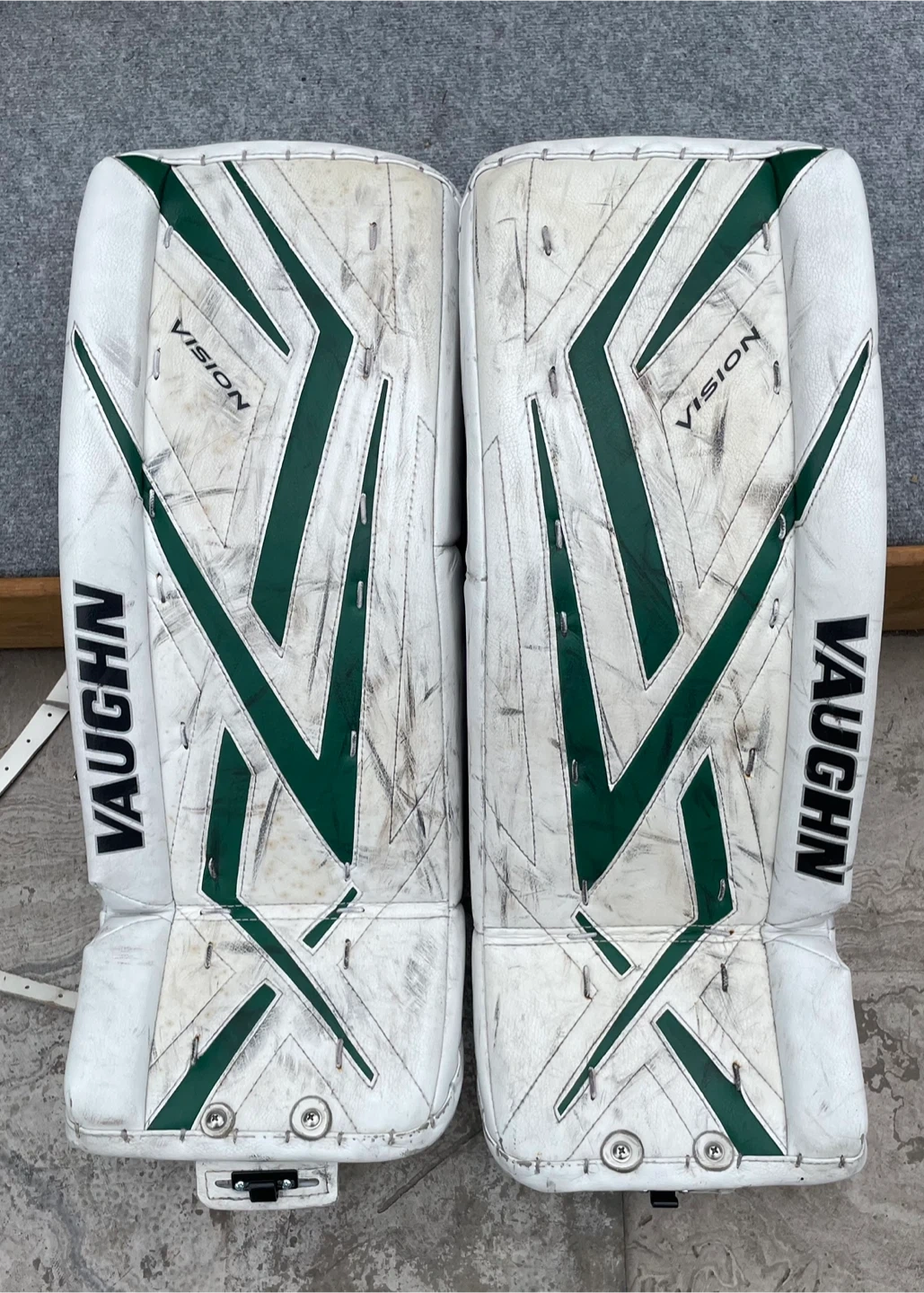 Vaughn Vision 25” goalie pads ready for the ice! These pads have seen some action, but they're still in good shape for practices or games. Perfect for a goalie looking for reliable gear!
