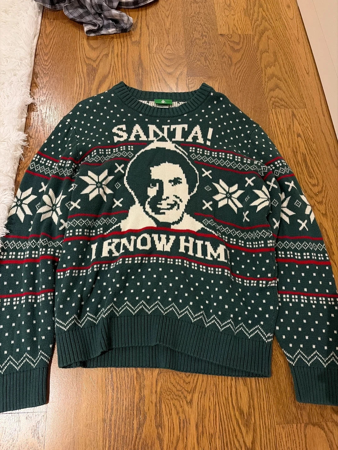 Get ready for the holidays with this festive Buddy the Elf sweater! It features Buddy's face and the iconic quote 'Santa! I Know Him!' against a green background with snowflake patterns. Perfect for spreading Christmas cheer! Ugly Christmas sweater vibes for sure!