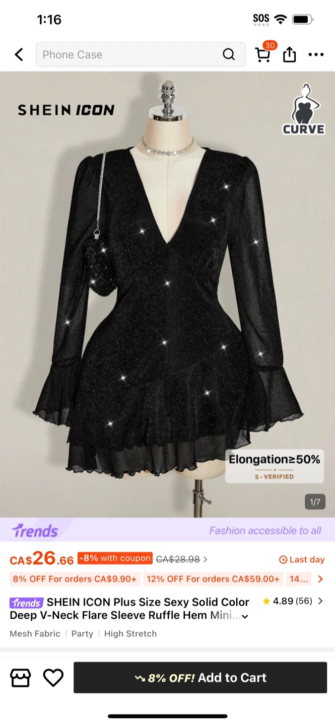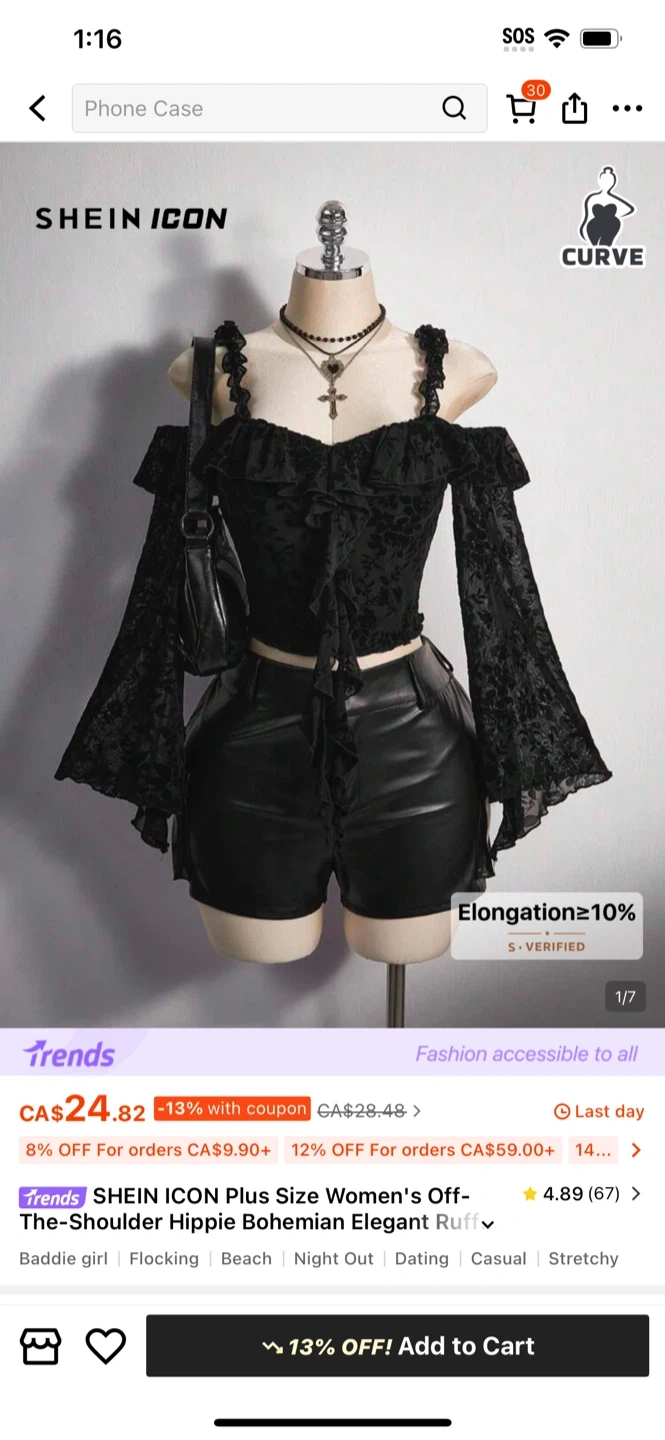 This black SHEIN ICON top has an off-the-shoulder design with elegant ruffles and long bell sleeves. It's made of a delicate fabric, perfect for a stylish evening out. The lace detailing adds a touch of bohemian flair.