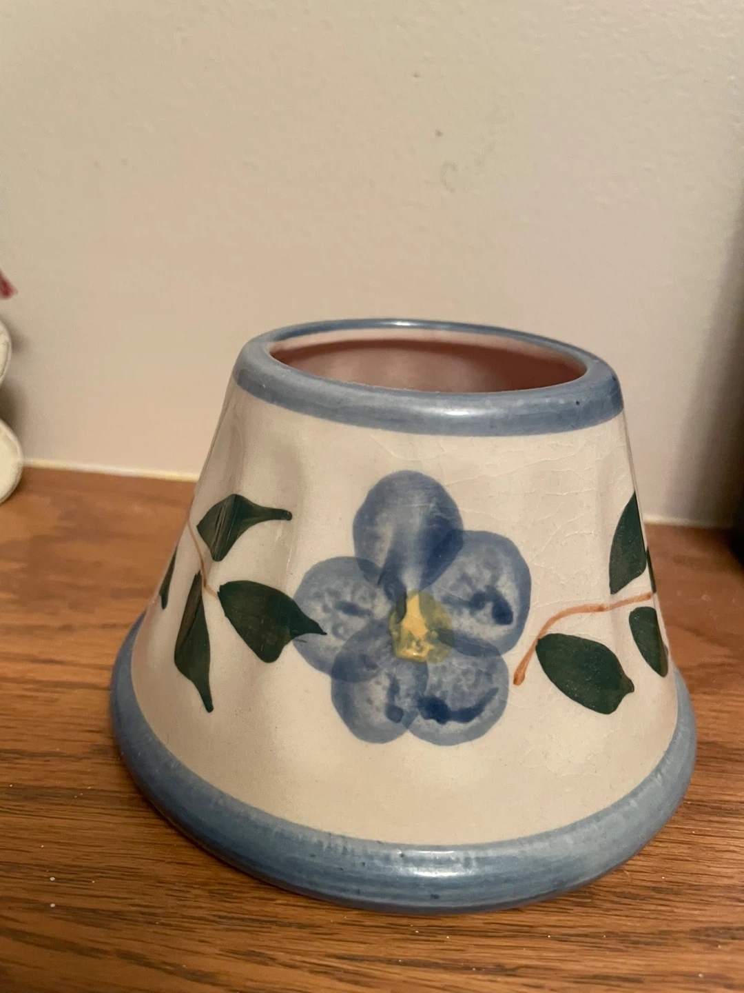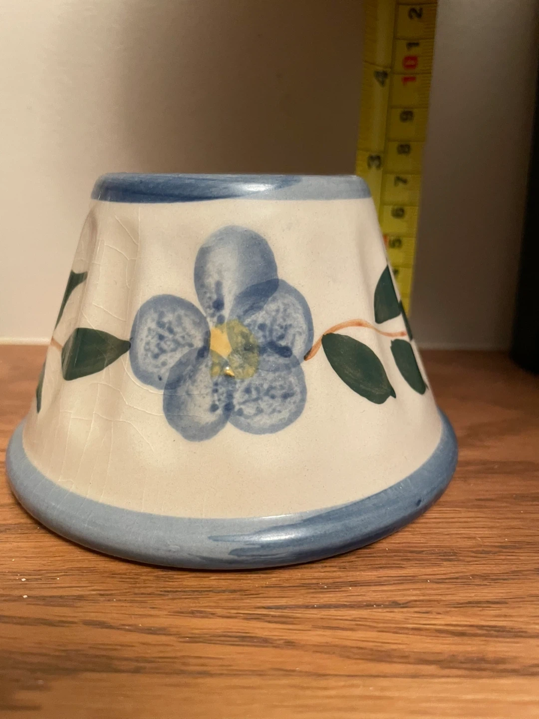 This ceramic candle holder features a charming blue floral design with green leaves. It has a distressed, crackled glaze finish. The holder is approximately 4 inches tall and 5 inches wide at the base. It's perfect for adding a decorative touch to your mantle or side table.