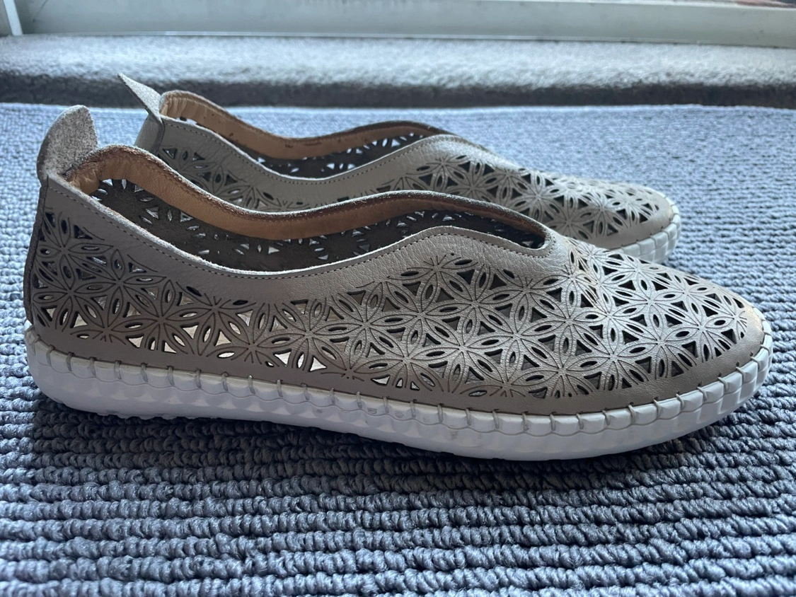 113Slip into the Daisy, and your everyday routine will become a bit smoother. The laser-cut floral accents make this your lightest summer shoe, and the small platform sole makes you feel like floating above the clouds. Leather shoes in color ‘light grey’ but looks more like a beige. Size 38 but fits more like 7.5. Brand new, never worn. Selling for $20 firm.