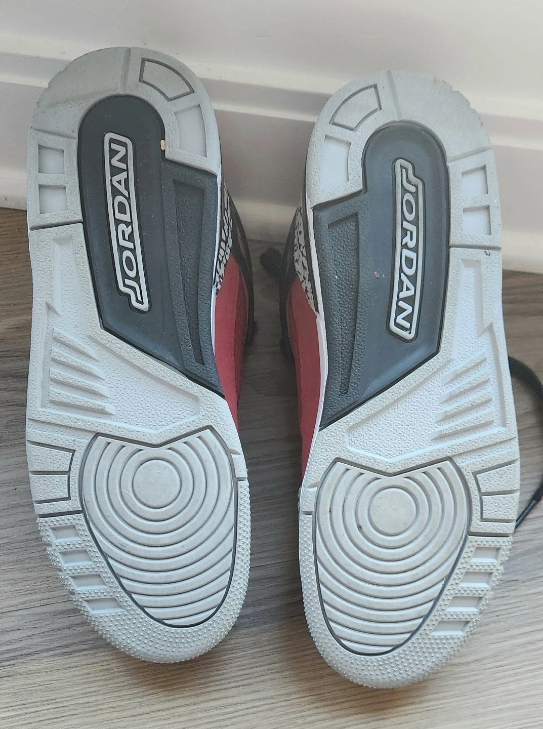 These are Jordan 3 sneakers in a red and black colorway. They're a youth size 7Y (US) or EU 40. Rubber sole with good tread.