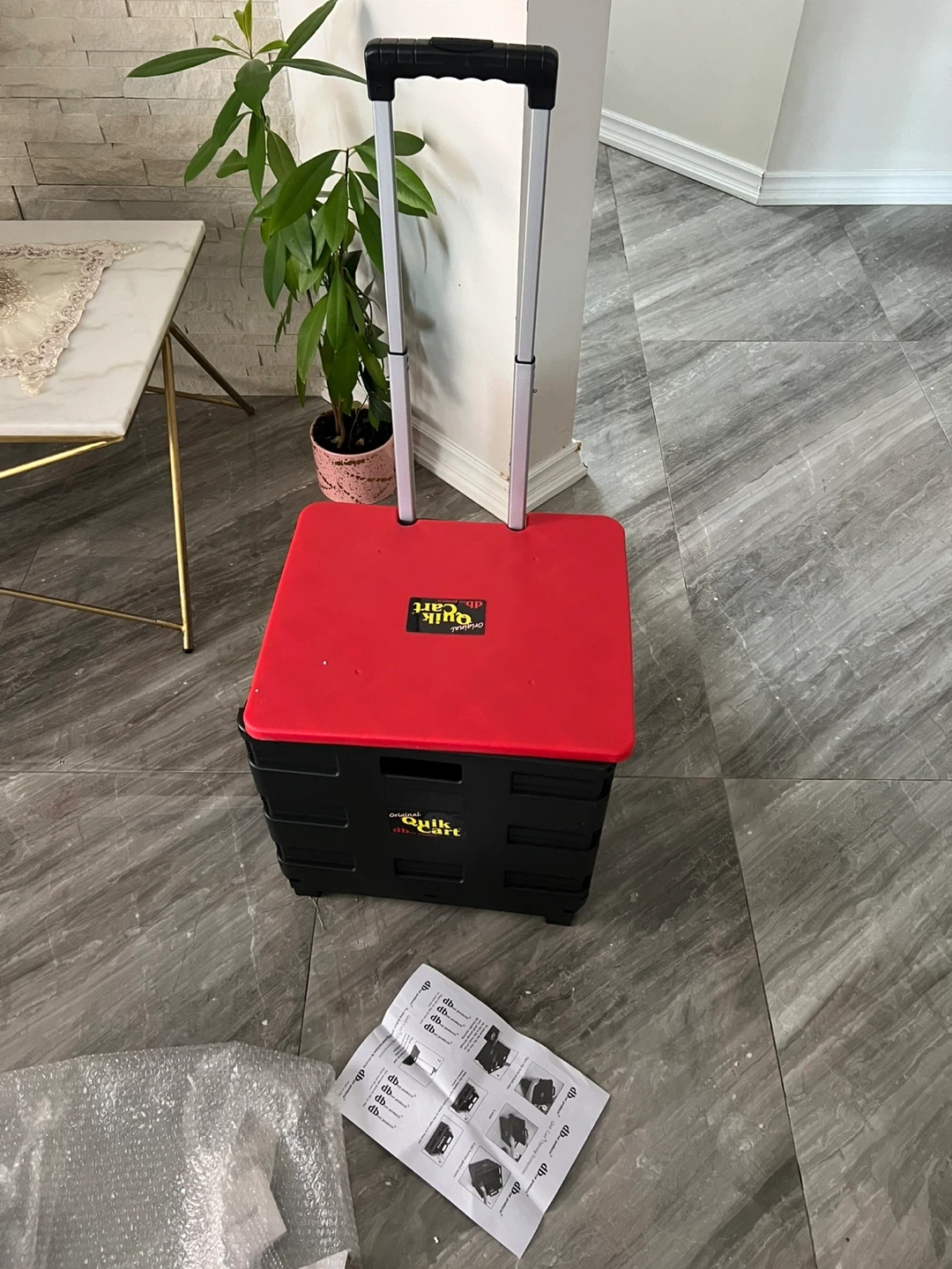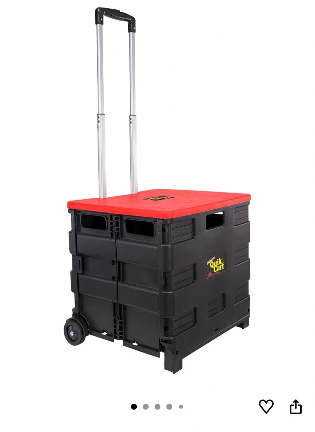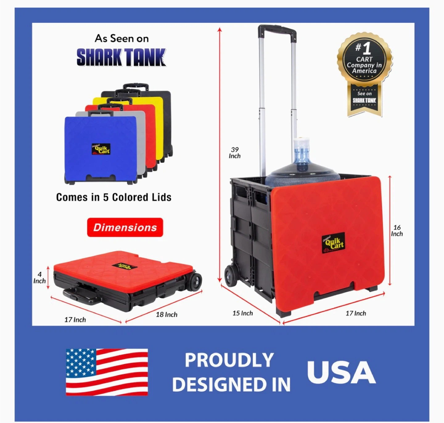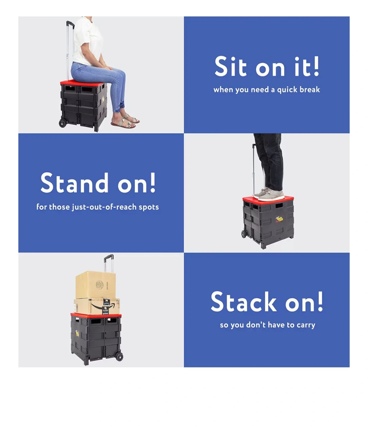 This Original Quik Cart is a handy rolling utility cart that folds flat for easy storage. It's designed for durability with a strong frame and reinforced base. Use it as a seat or stepstool when needed!