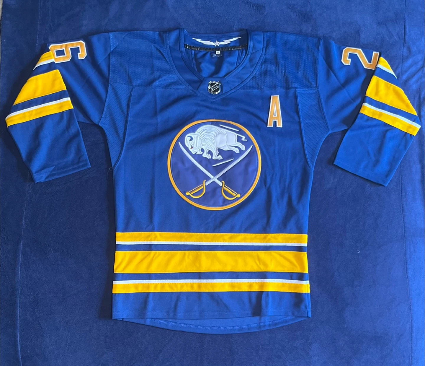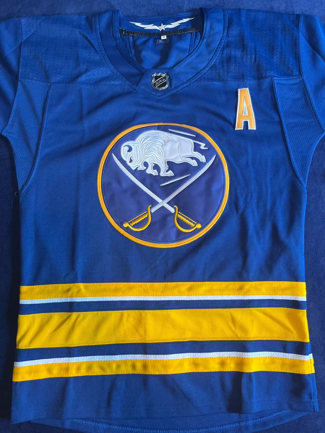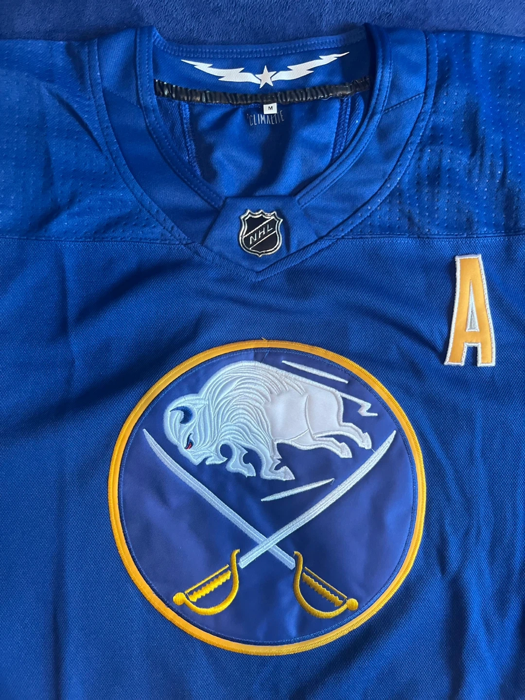 34Selling a Buffalo Sabres hockey jersey, featuring Dahlin #26! It's a size medium and in great shape. The jersey is blue with yellow and white accents, showcasing the Sabres logo on the front. Perfect for any hockey fan! Asking $90 but open to offers