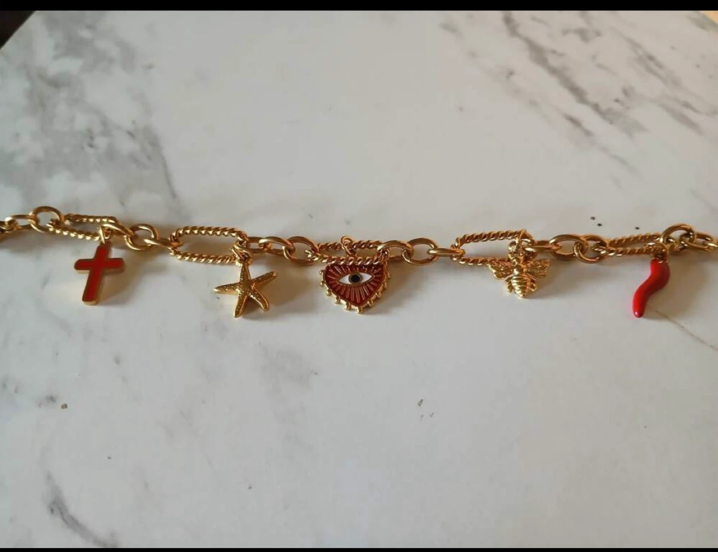 Check out this cute gold-tone bracelet! It features a mix of charms including a red heart with an eye, a red cross, a starfish, a bee, and a red chili pepper. The bracelet is about 17cm + 5cm in length and weighs 11g. ✔ Features of 18K gold plated stainless steel: