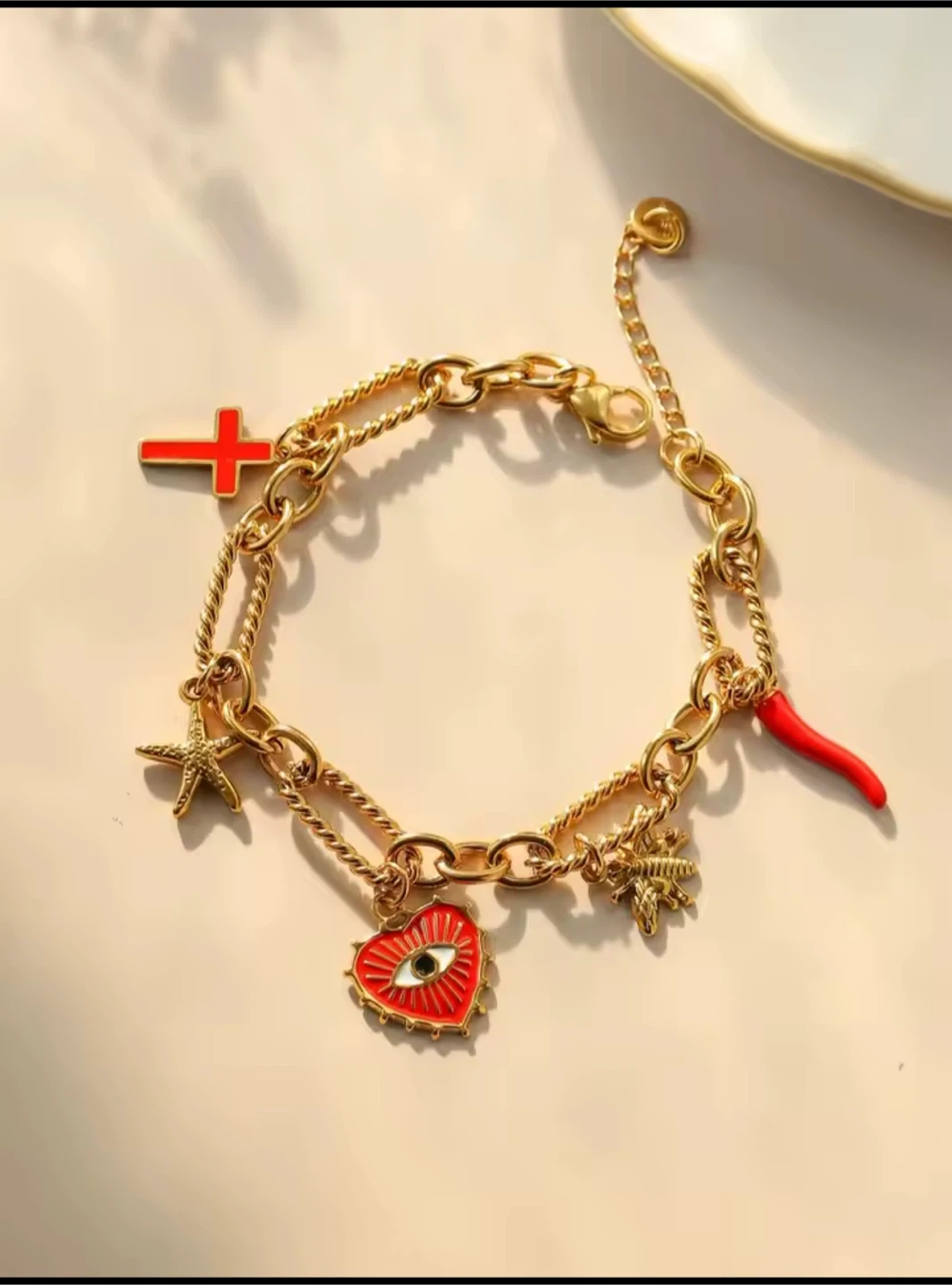 Check out this cute gold-tone bracelet! It features a mix of charms including a red heart with an eye, a red cross, a starfish, a bee, and a red chili pepper. The bracelet is about 17cm + 5cm in length and weighs 11g. ✔ Features of 18K gold plated stainless steel: