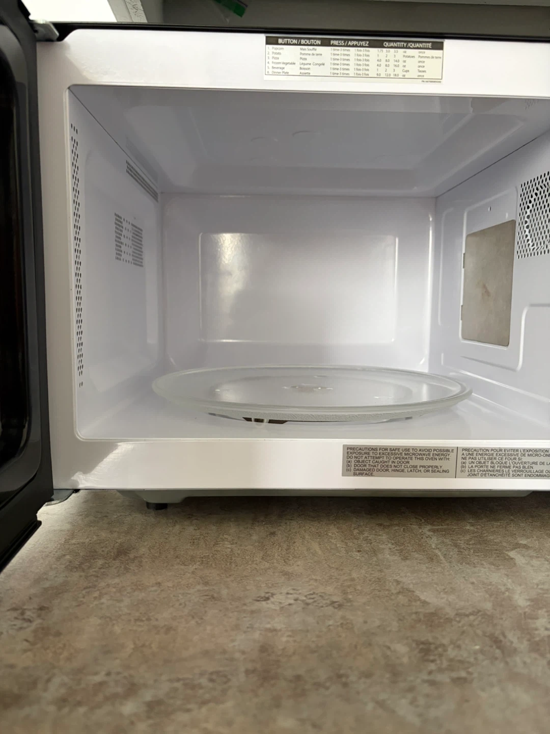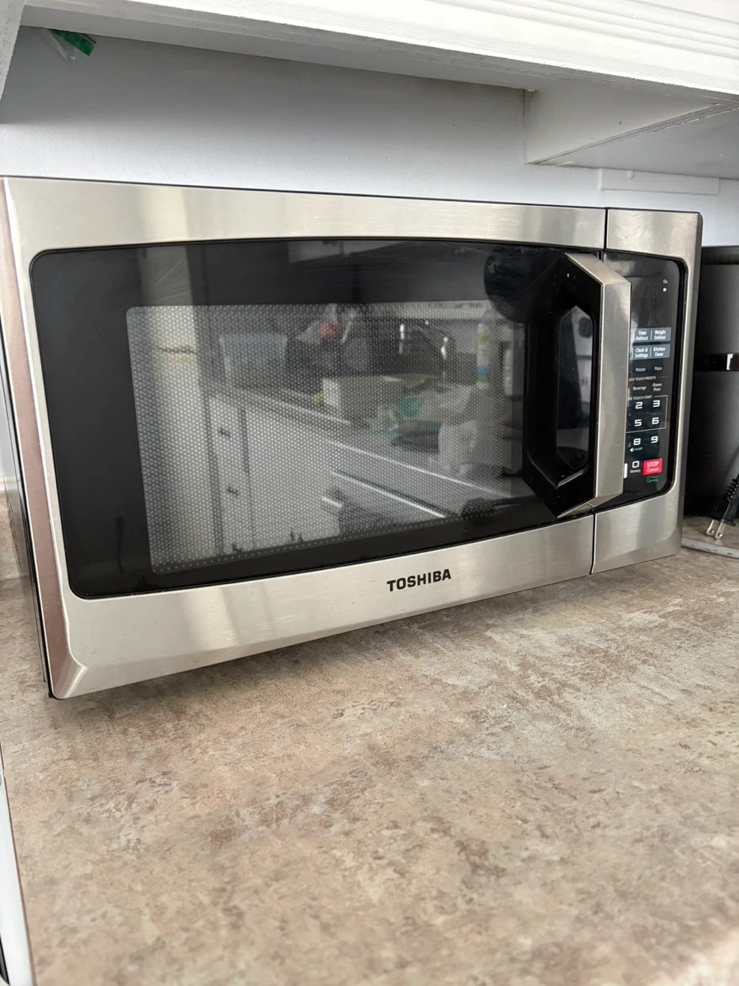 This is a Toshiba stainless steel microwave oven. It includes a glass turntable. Quick touch presets for popcorn, potato, and pizza are available.