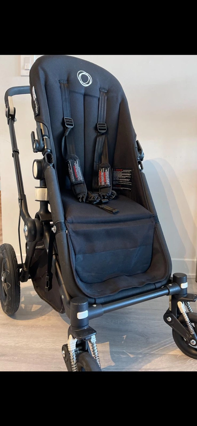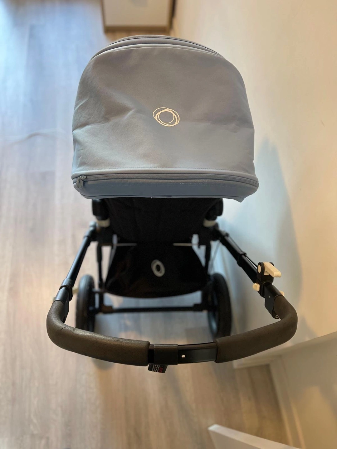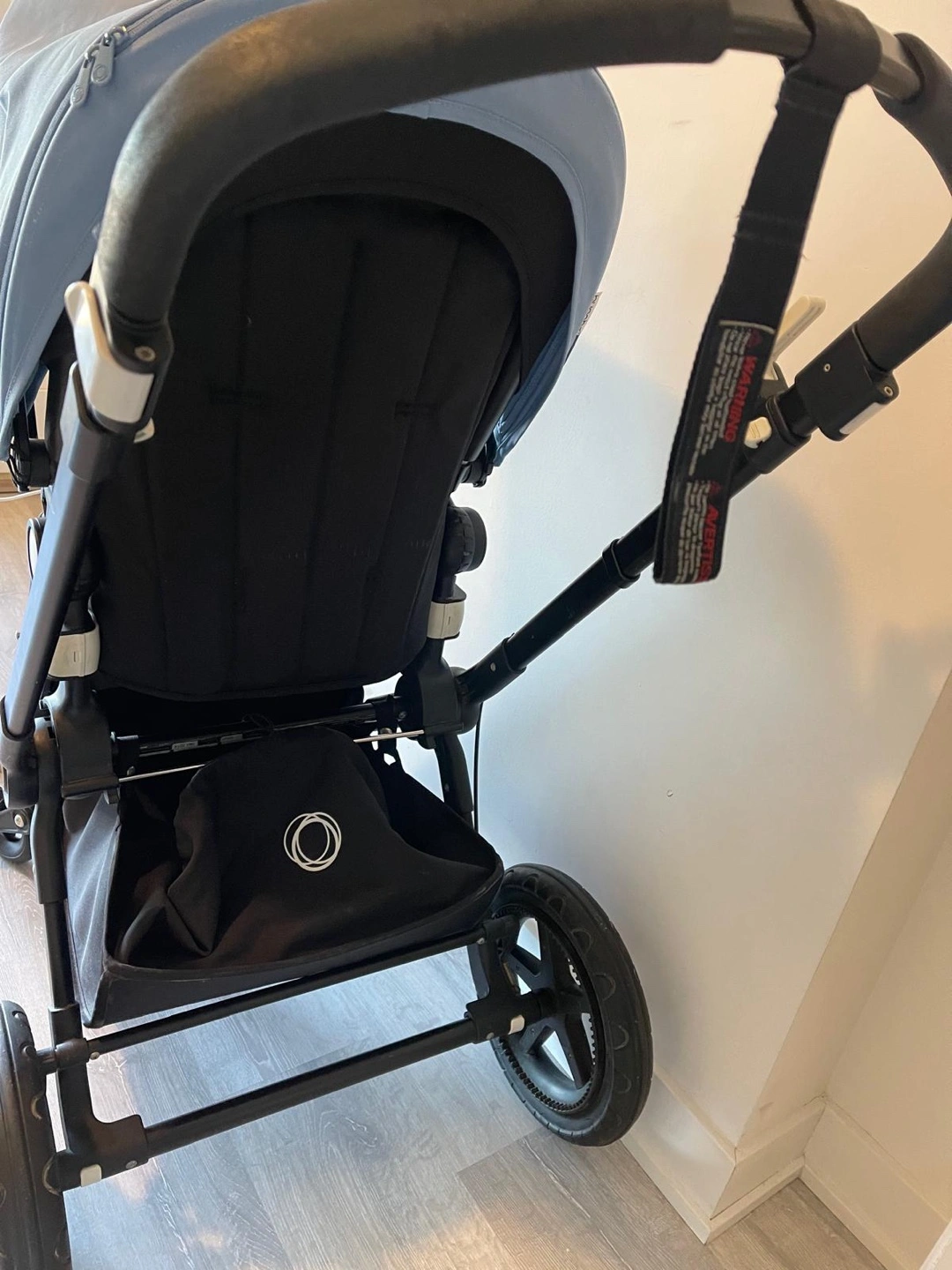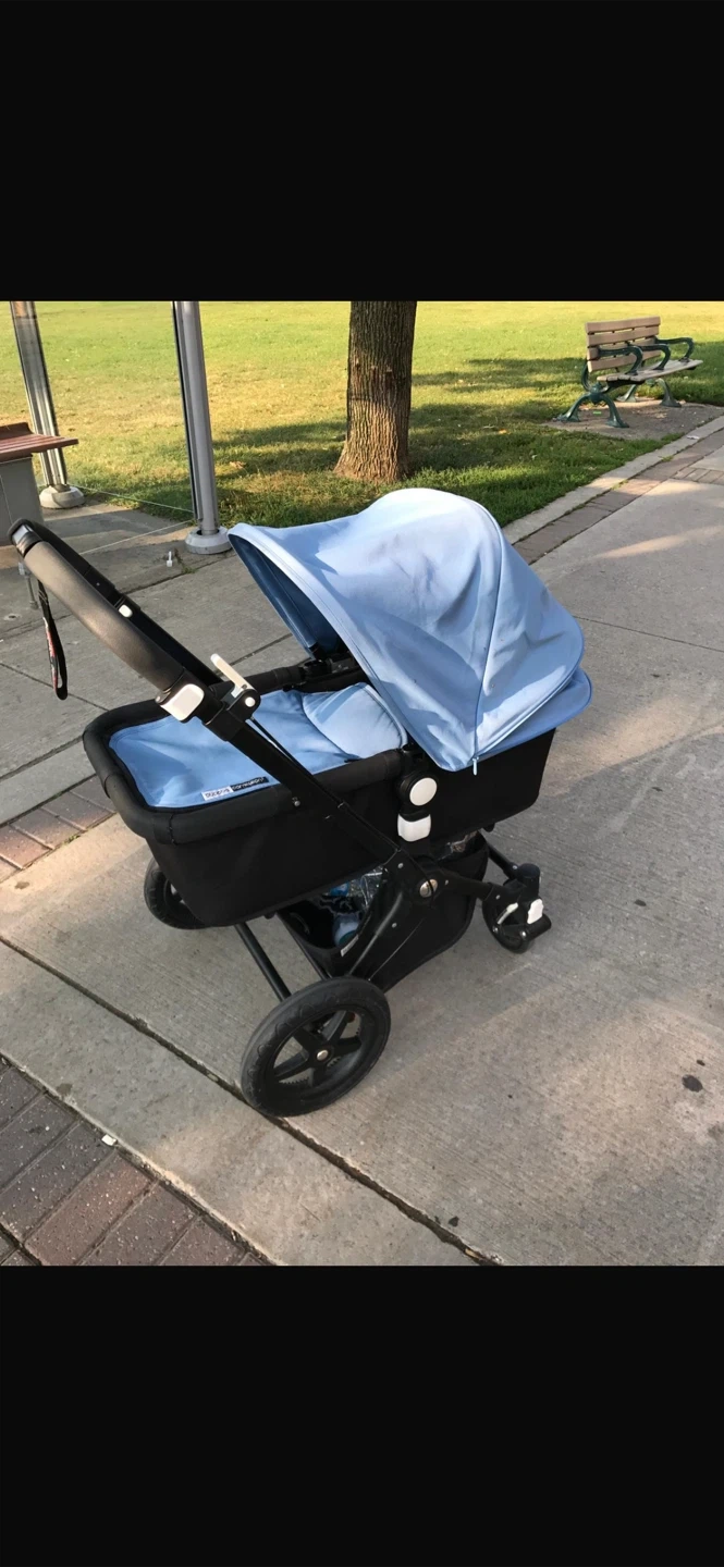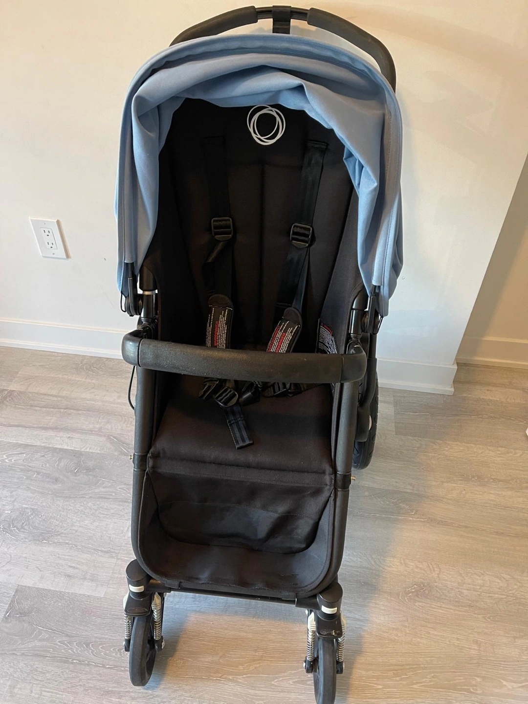 Blue canopy, black frame and seat. Includes storage basket & infant bassinet. Good condition.
