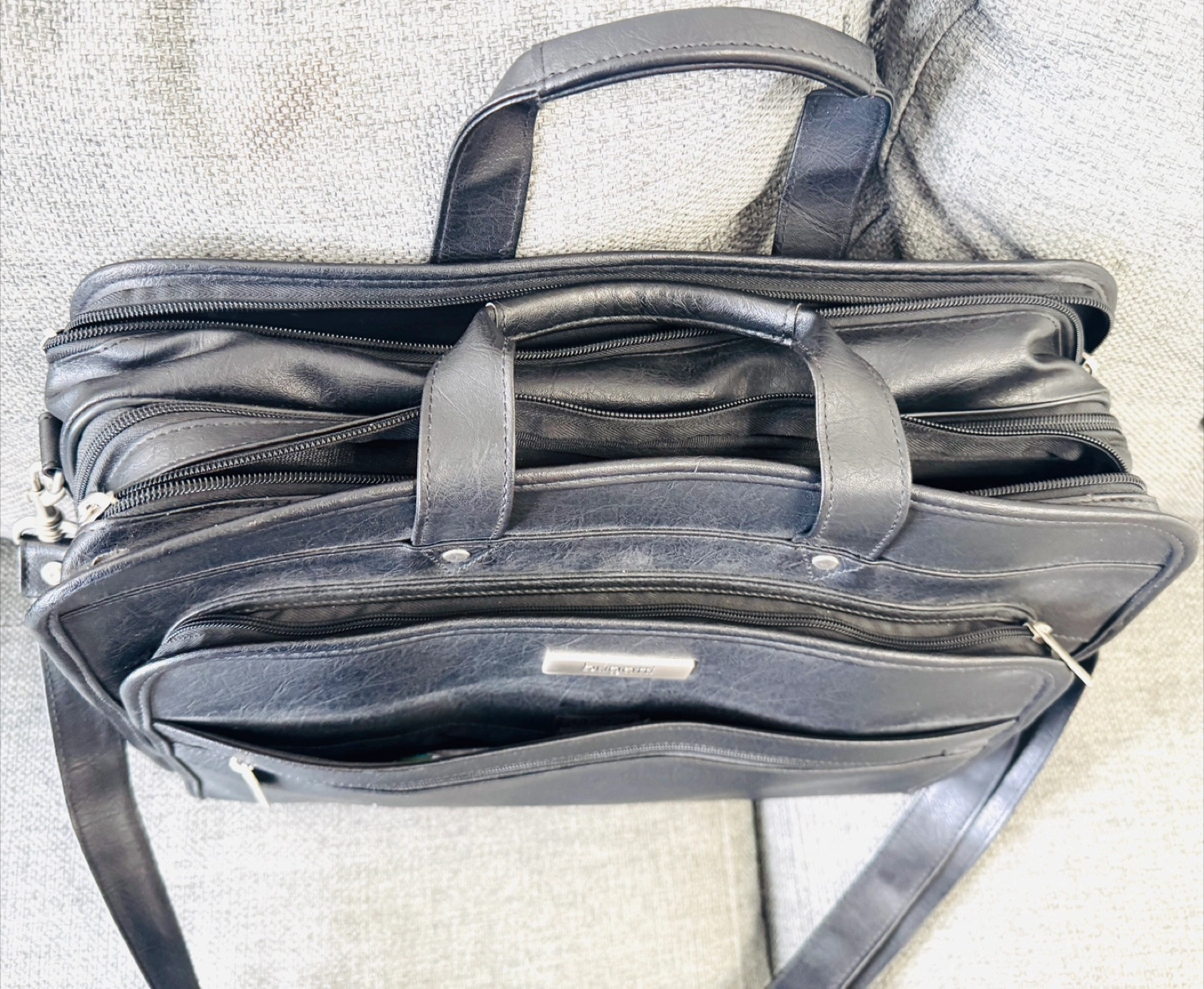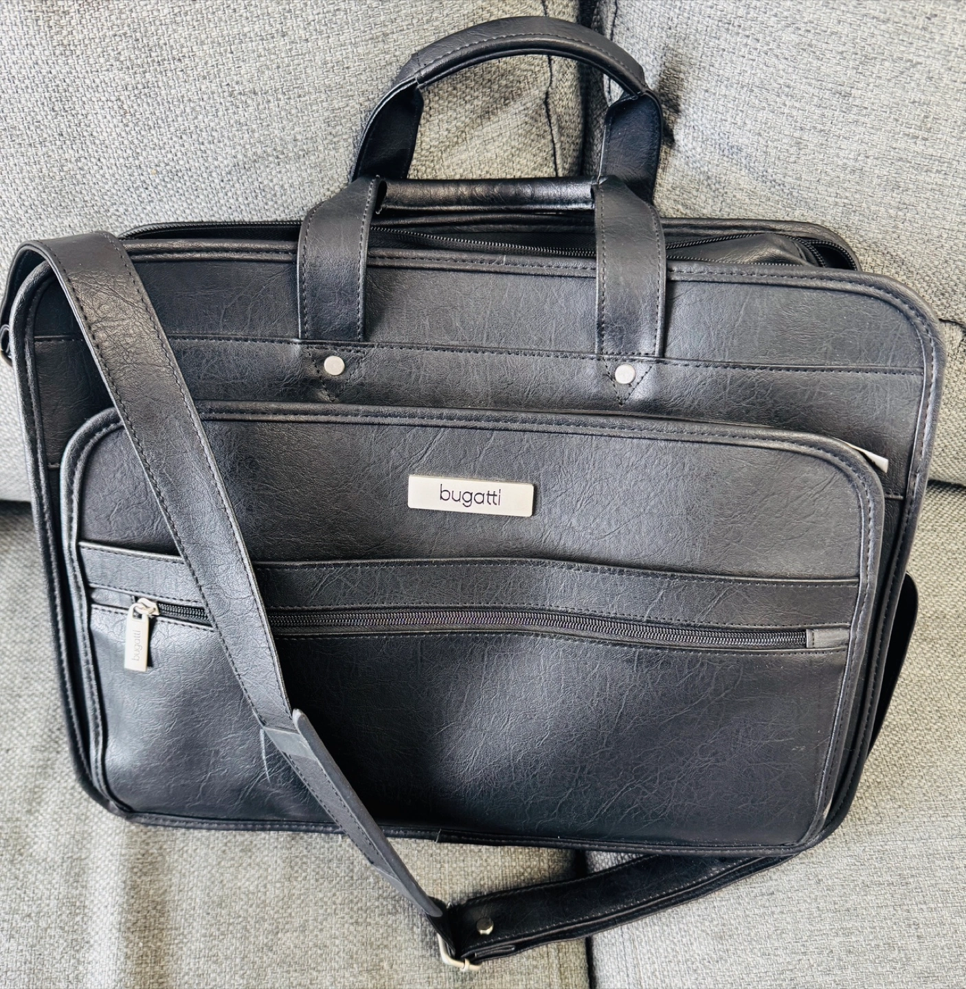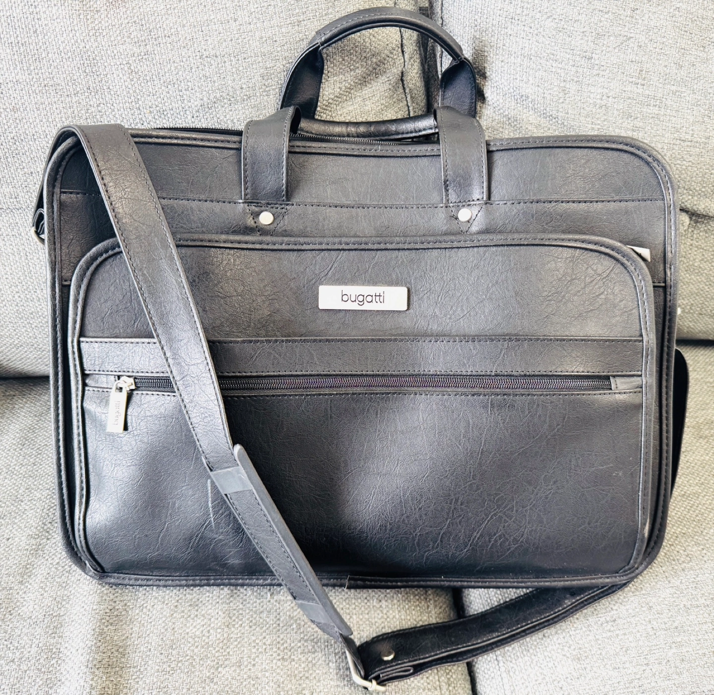 Black leather briefcase. Multiple compartments and zipper closures. Adjustable shoulder strap and top handle. Excellent for work or travel. Bugatti Black Leather Briefcase