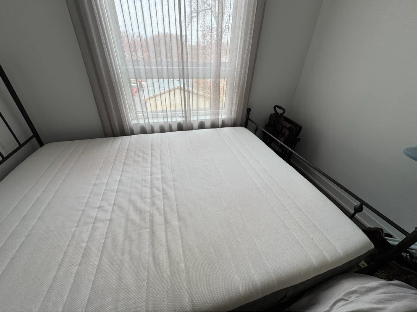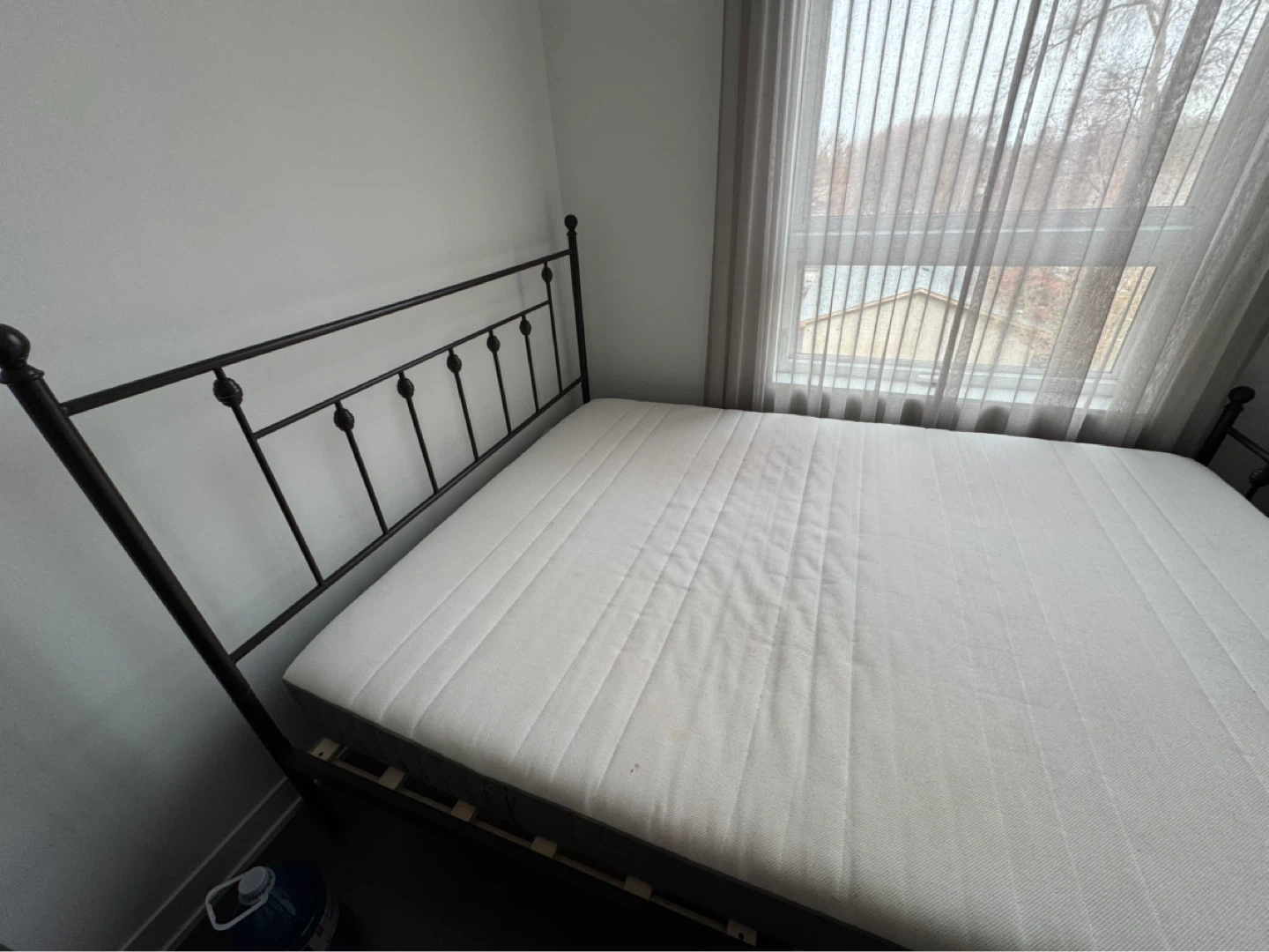 Selling a black metal bed frame. It's in great condition and would look great in any bedroom! It's a platform bed, so no box spring is needed. Ikea queen mattress (medium firm). There is plenty of space under the bed for storage. Giving away both the bed and mattress together. There is good clearance for storage under the bed. Both bed frame and mattress were purchased in 2022. Gently used mattress in the guest bedroom. The mattress cover can be removed and is machine washable. Mattress firmness is medium firm. (Available for immediate pickup and available till 25th April (move out date). Can be dismantled by me prior to your arrival but if you want to see it in person when you arrive, you can dismantle it to see how it all fits together. If you're interested, feel free to message me! Send me a note for more photos/videos. Pick up only from Scarborough location: Intersection: Kennedy and St. Clair Ave. E.