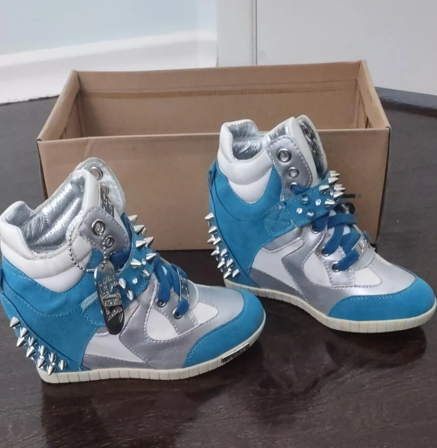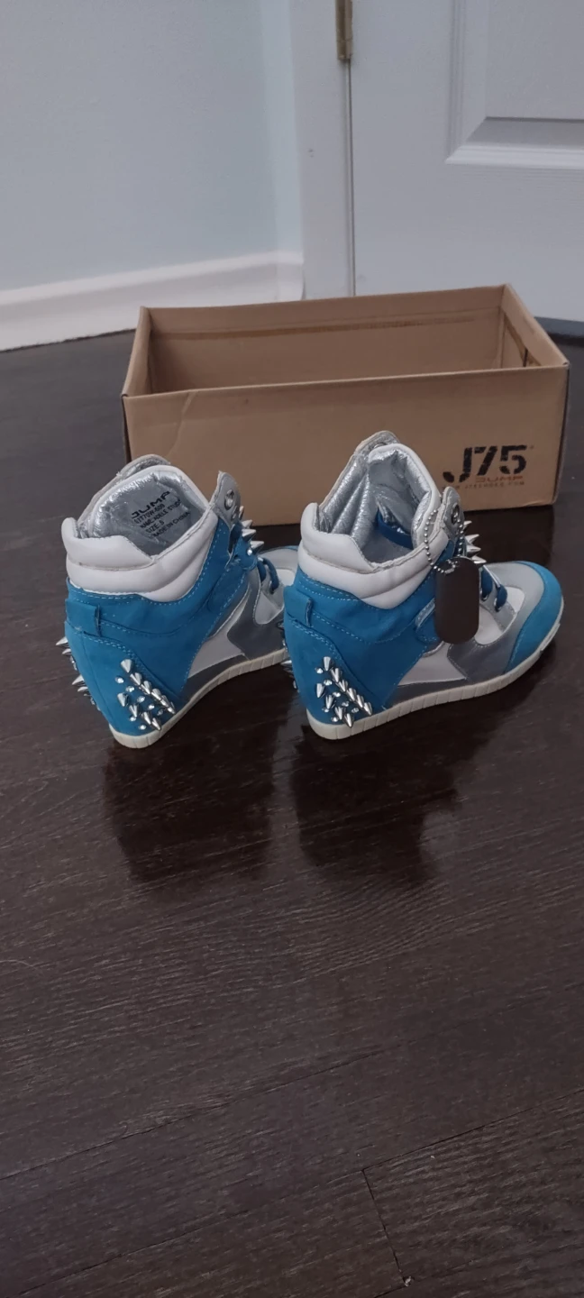 These J75 wedge sneakers feature a stylish blue and silver design. They're adorned with silver spikes on the heel and sides. Comes with the original box.