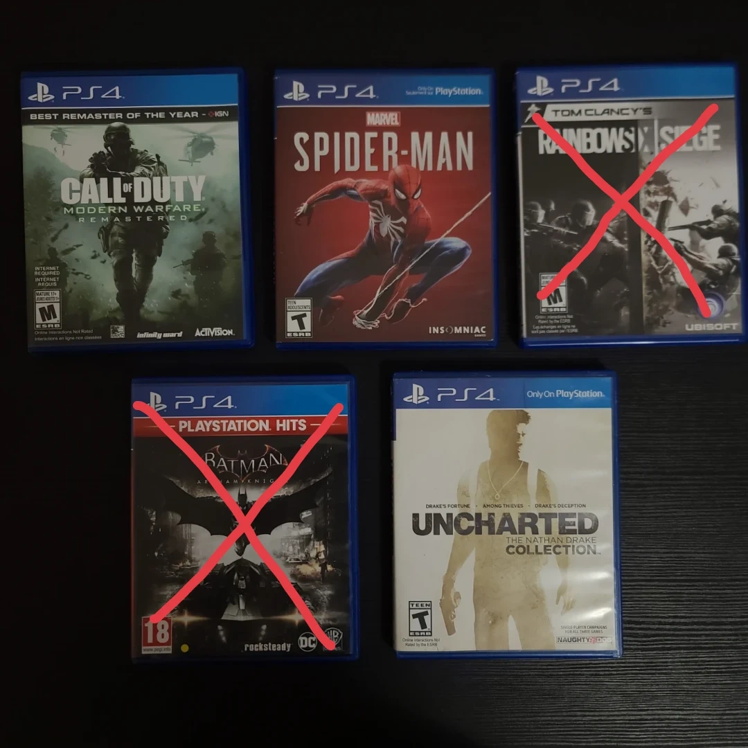 Selling five PS4 games: Call of Duty: Modern Warfare Remastered, Marvel's Spider-Man, Tom Clancy's Rainbow Six Siege, Batman: Arkham Knight, and Uncharted: The Nathan Drake Collection. All are disc versions in their original cases.