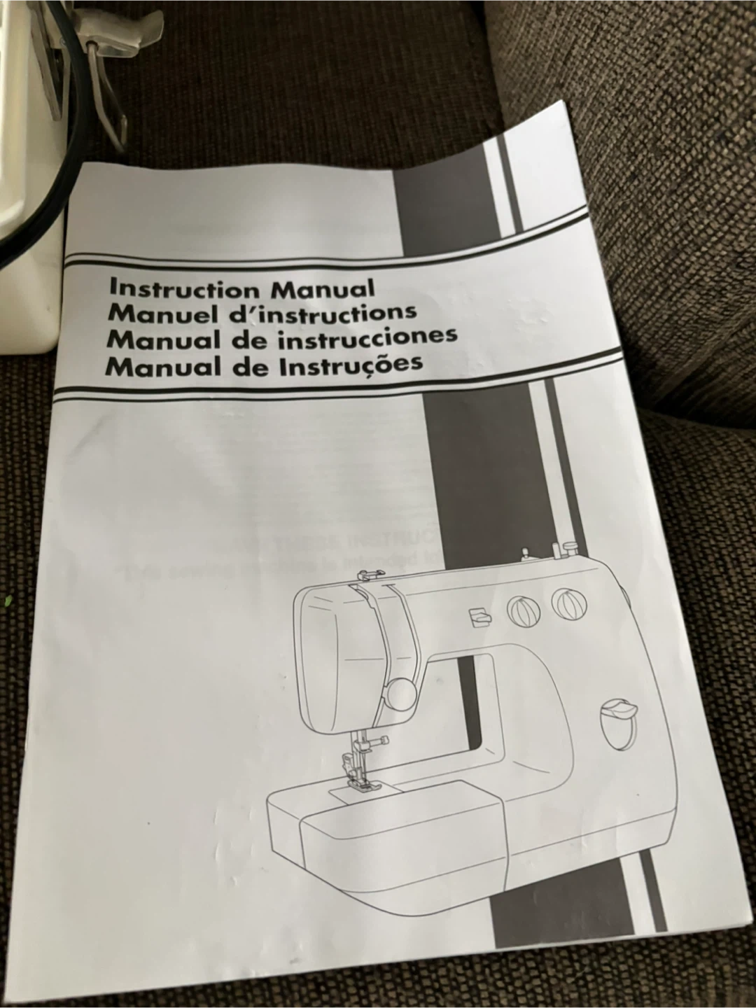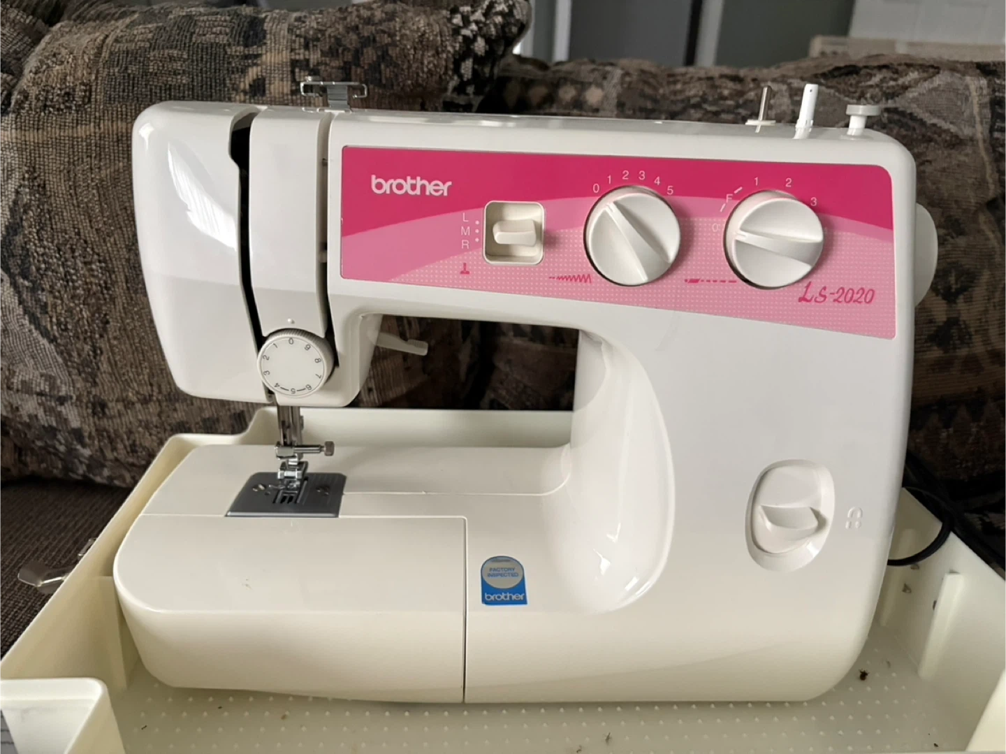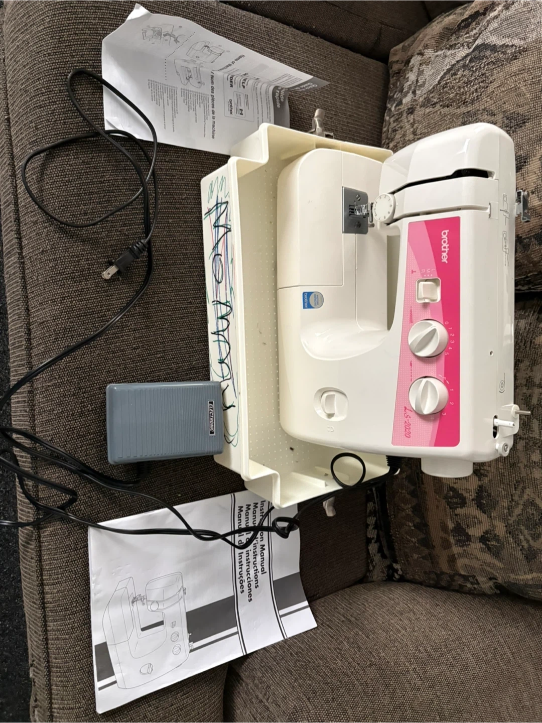 This is a white Brother LS-2020 sewing machine. It includes the instruction manual and foot pedal. Perfect for beginner sewing projects!