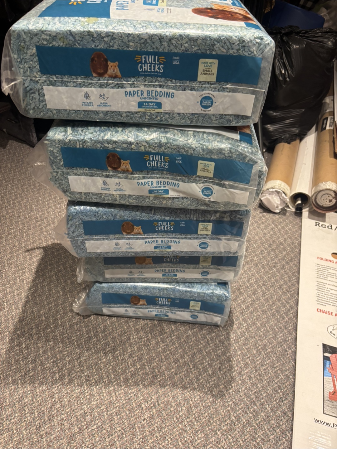 Selling multiple bags of Full Cheeks paper bedding for small animals! This bedding is unscented and provides 14-day odour control, so your little critters stay comfy and clean