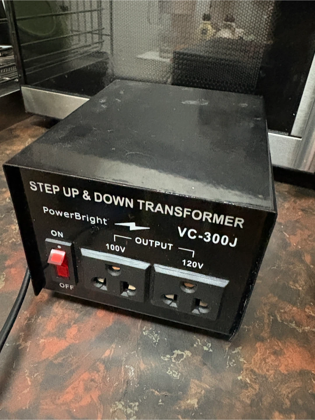 PowerBright VC-300J step up and down voltage transformer. Converts 100V to 120V and 120V to 100V. Includes an ON/OFF switch.