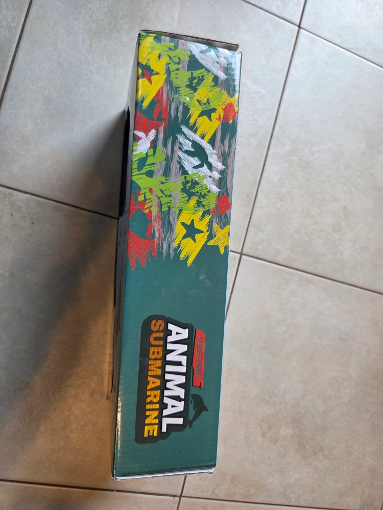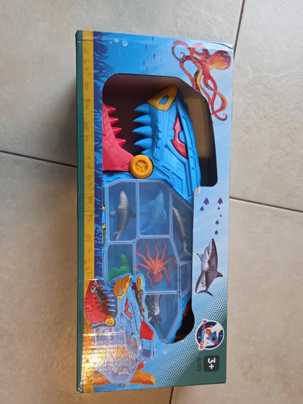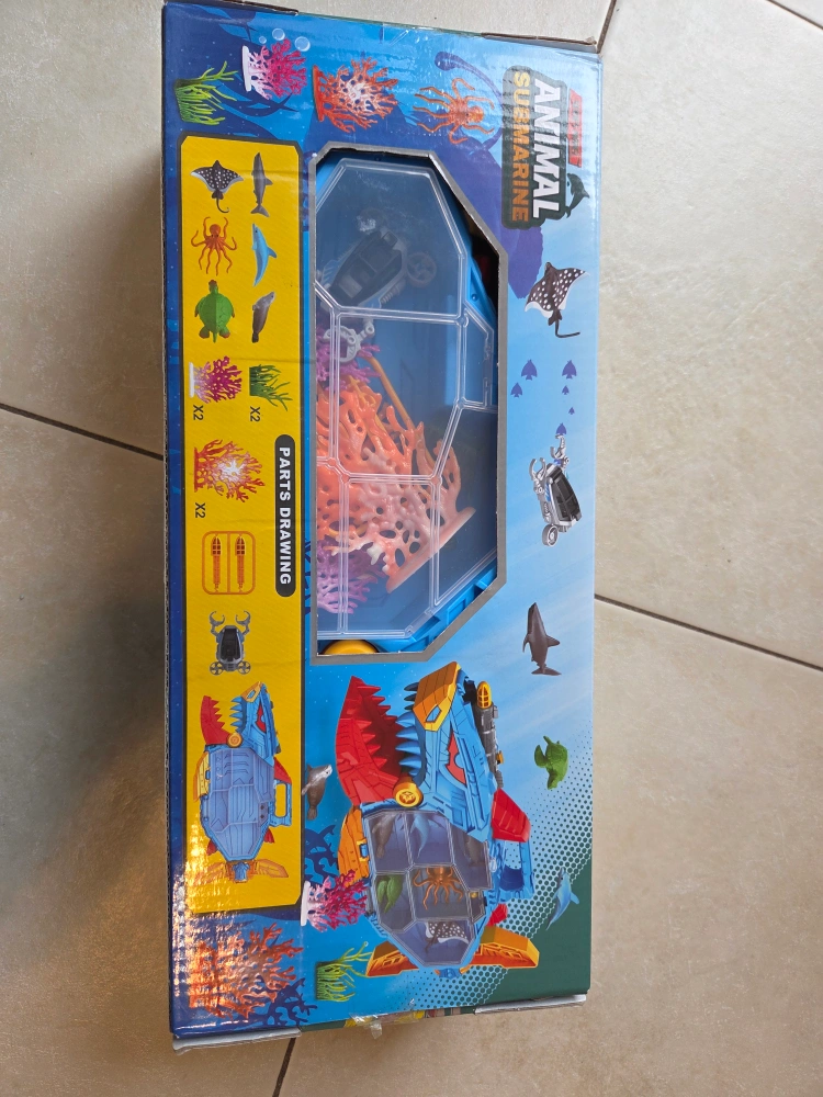 This toy submarine set includes various sea animals and coral pieces. It's designed for children aged 3 and up. Comes with all parts shown in the packaging.