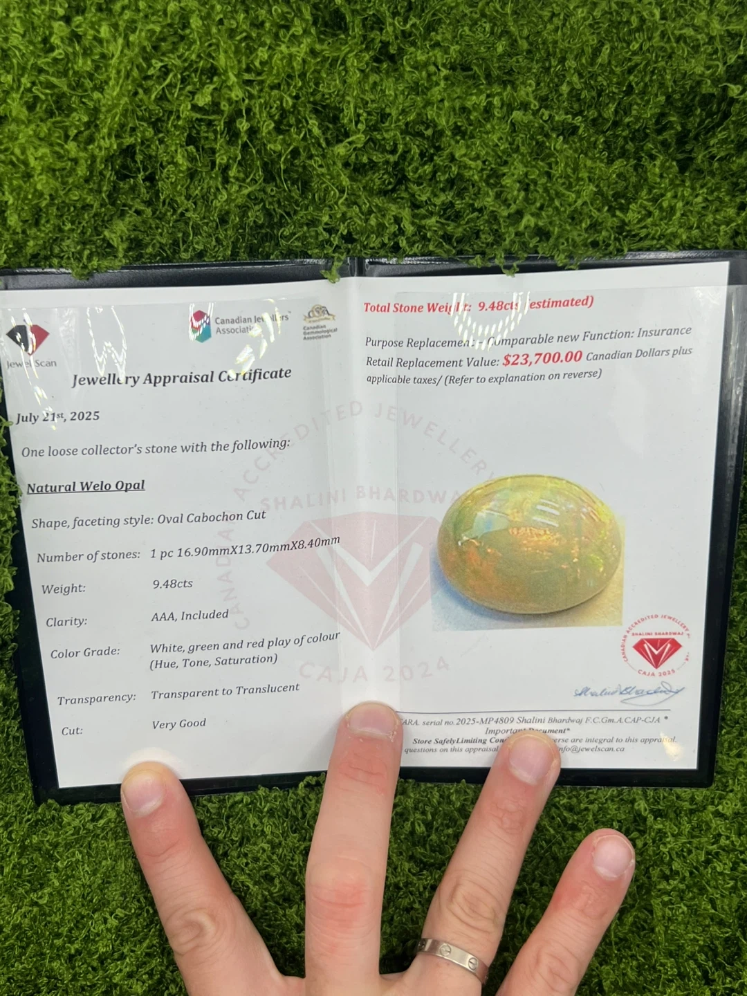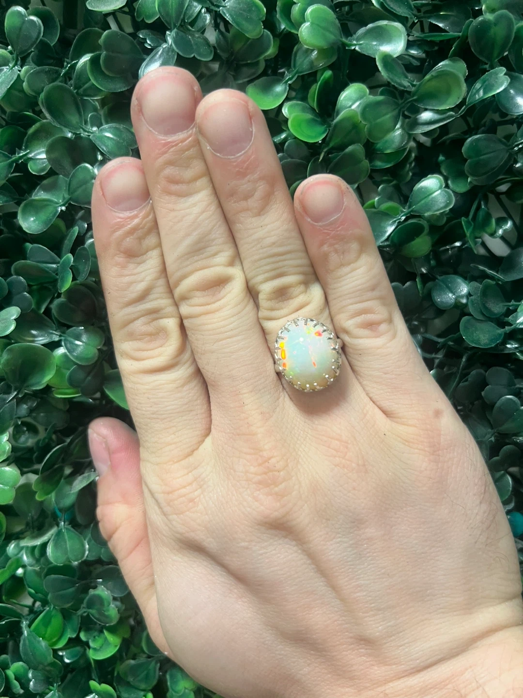A stunning natural Welo Opal loose collector's stone set in a ring. It's a 9.48ct oval cabochon with a white, green, and red play of colour. Transparency is transparent to translucent, and it's cut very well! This unique piece would make a wonderful addition to any jewellery collection.