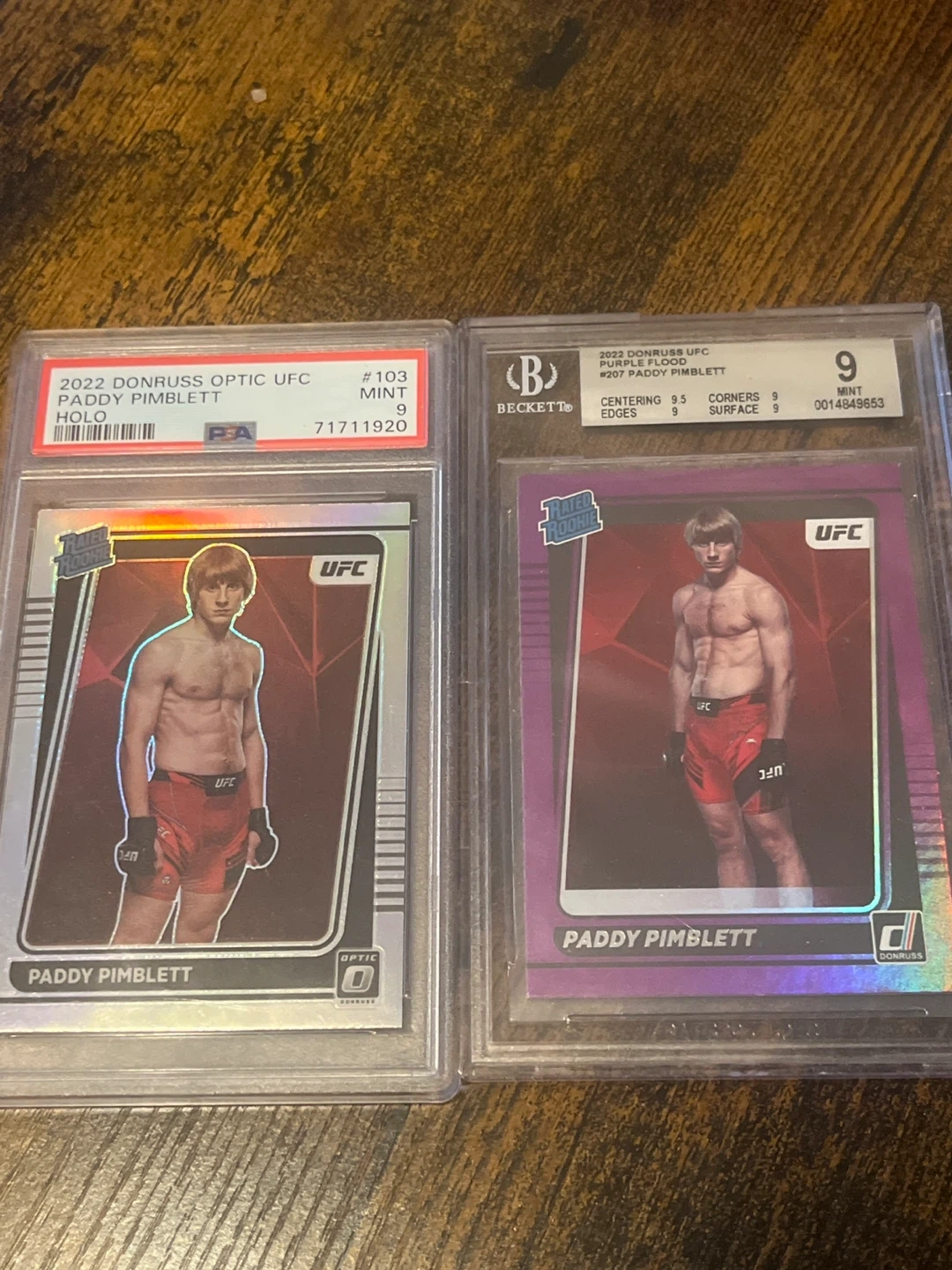 Two graded trading cards featuring UFC fighter Paddy Pimblett. One is a 2022 Donruss Optic UFC Holo card graded PSA 9. The other is a 2022 Donruss UFC Purple Flood card graded Beckett 9. These cards showcase the fighter's early career appearances.