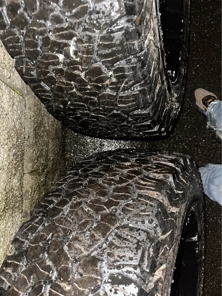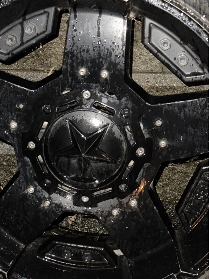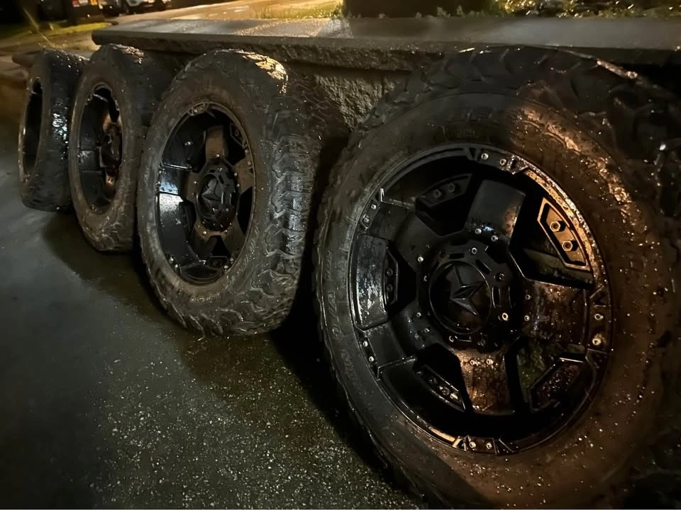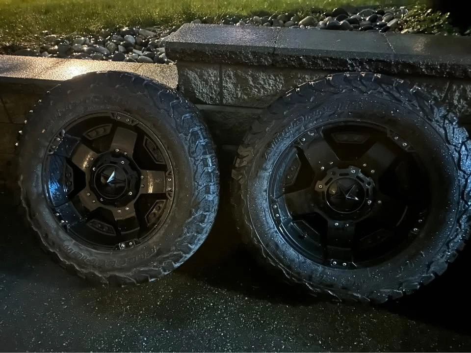 These are 20-inch Rockstar rims with an 8-bolt pattern, fitted with BF Goodrich KO2 tires. They came off of a Dodge and have at least one good season left on the tires, possibly more.