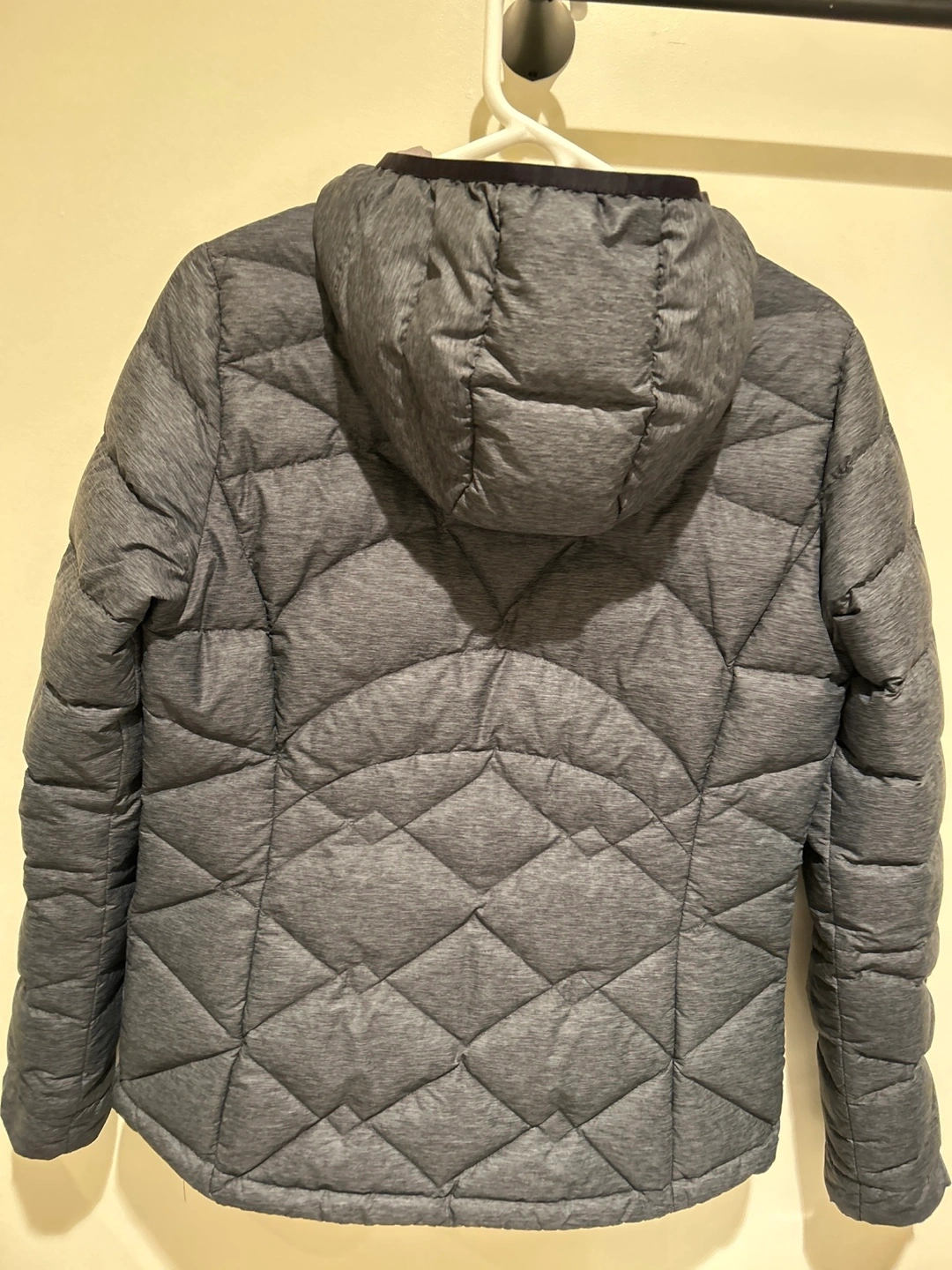 Columbia quilted puffer jacket with a hood. It's grey and water-resistant. This jacket is perfect for staying warm on chilly days. medium size