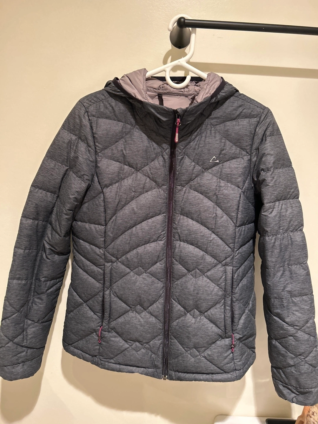 Columbia quilted puffer jacket with a hood. It's grey and water-resistant. This jacket is perfect for staying warm on chilly days. medium size