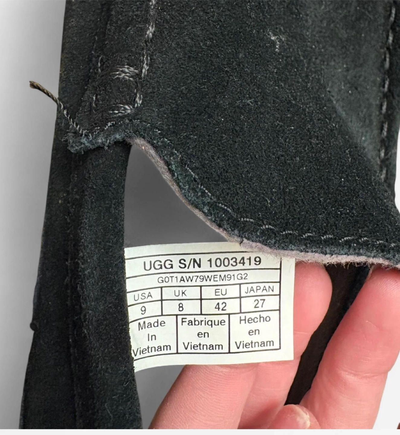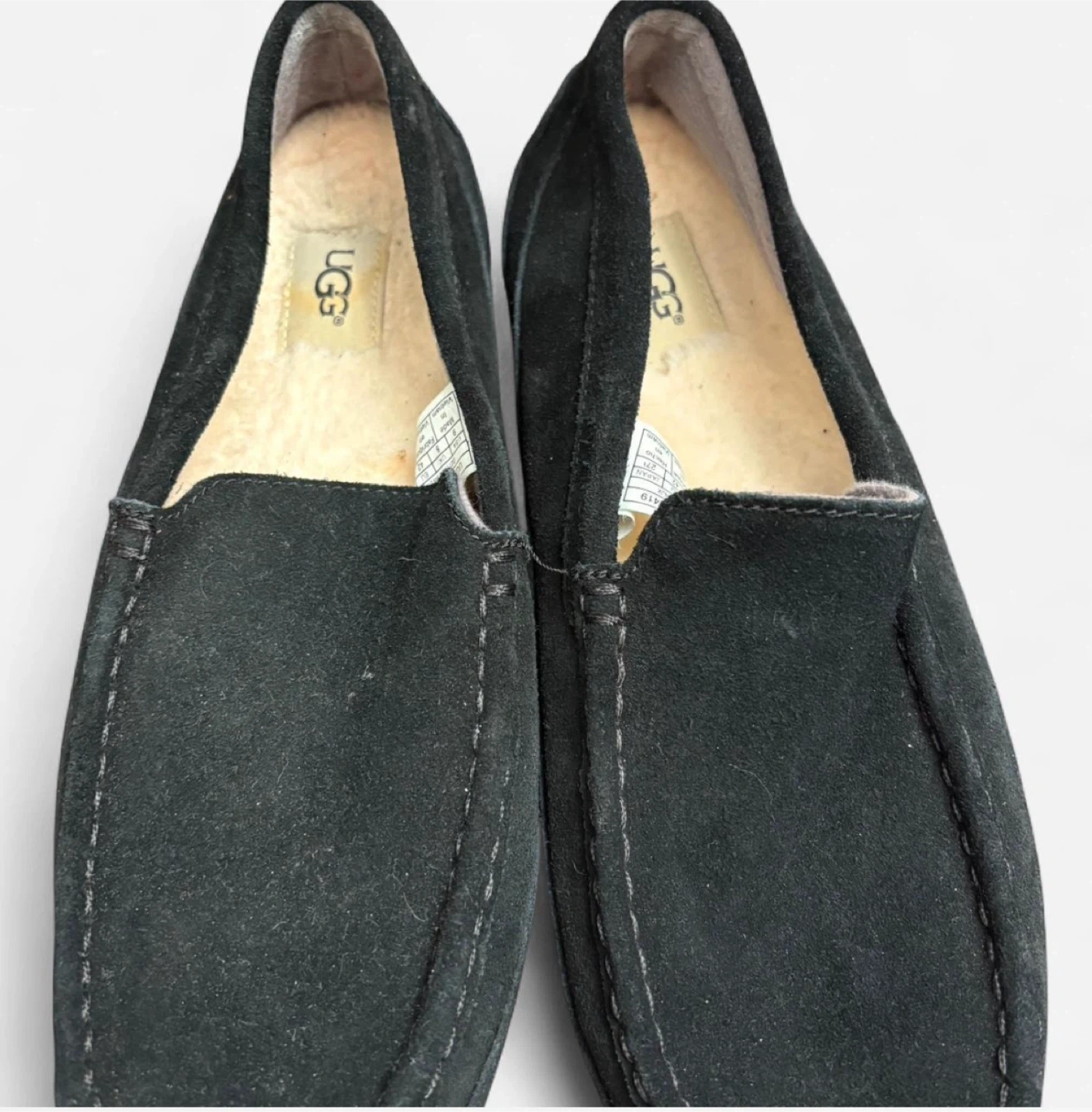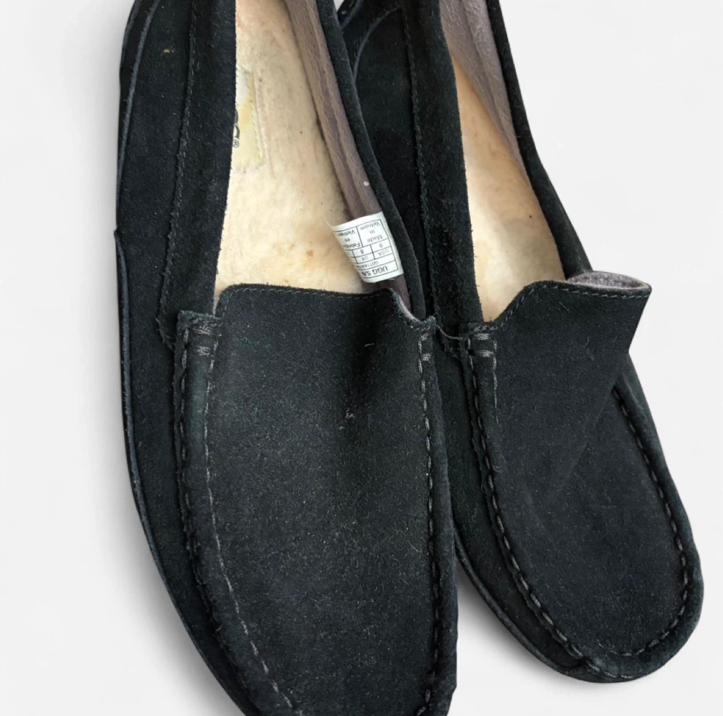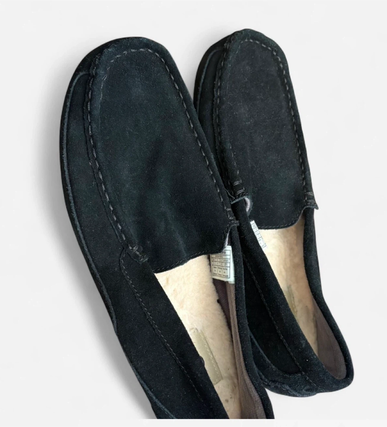 Cozy up with these UGG men's moccasin slippers! They're a size 9 and made with soft suede. Perfect for keeping your feet warm and comfortable around the house. The slippers are black, so they will match any outfit!