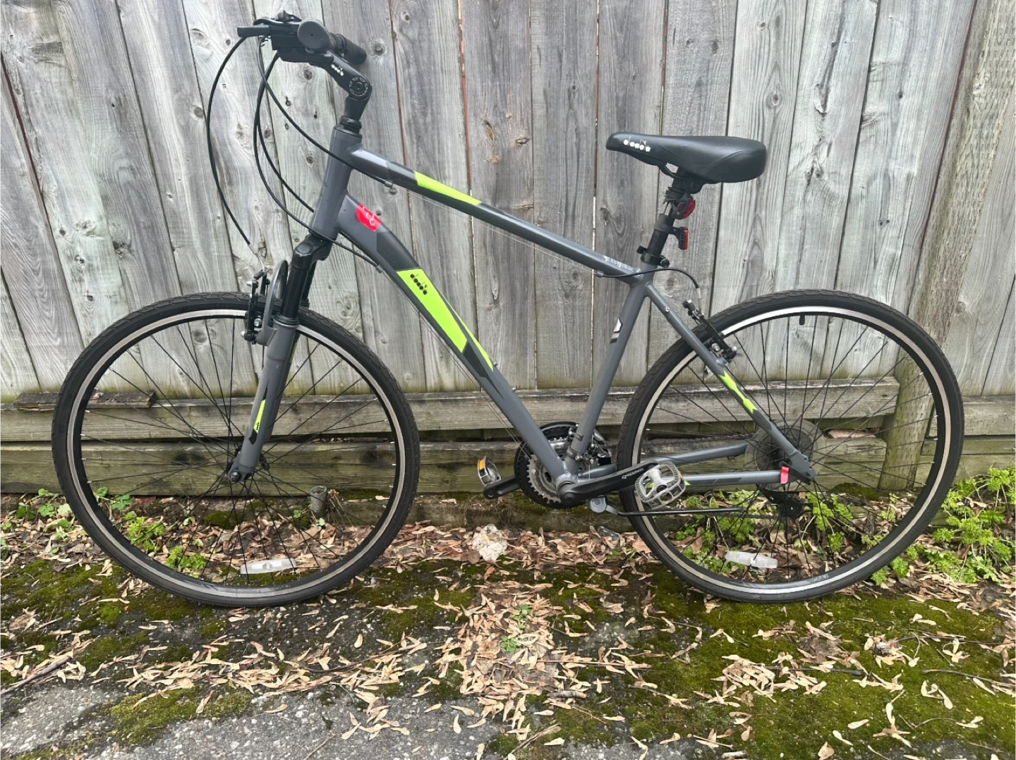 Grey hybrid bike with lime green accents. It's a sturdy bike that's great for commuting or recreational rides. Ready for your next adventure!
