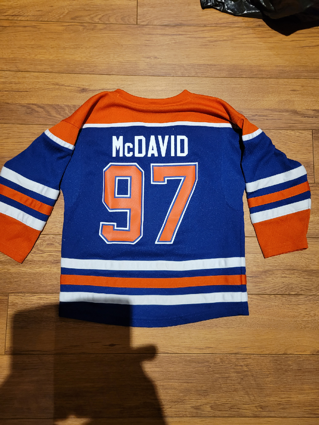 Selling a toddler-sized Edmonton Oilers jersey with McDavid's name and number 97 on the back! The size is 4/7, perfect for your little Oilers fan. It features the classic Oilers logo on the front and the NHL logo on the chest. Great for game days or just showing team spirit!