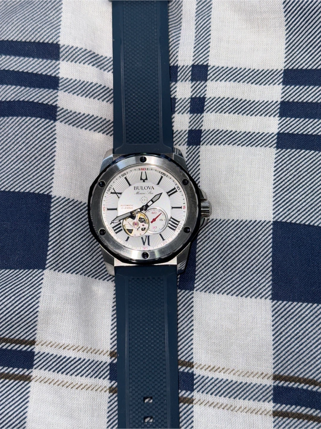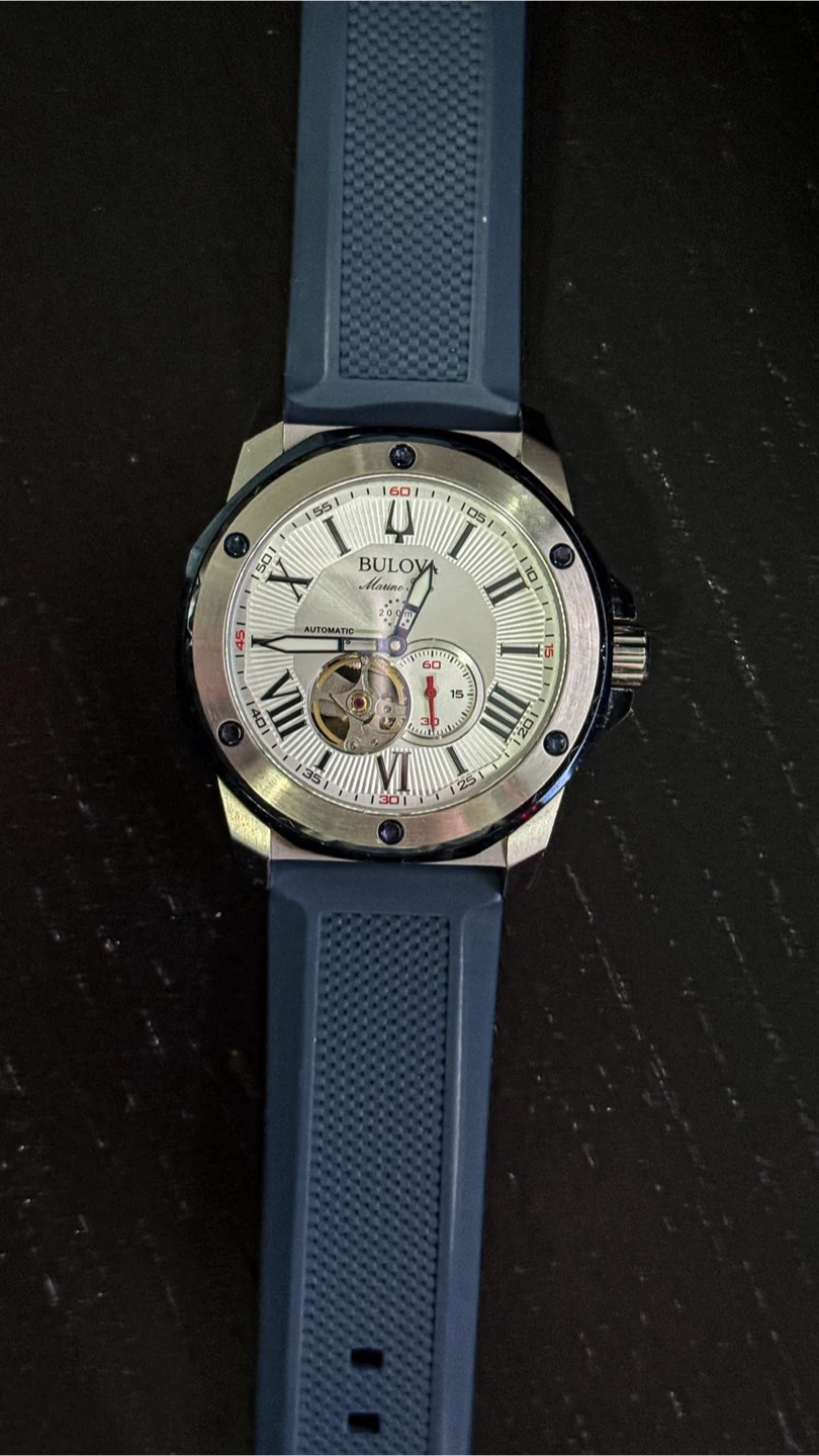 Selling a Bulova men's automatic watch! It features a stylish design with a silver-tone case and a blue rubber strap. This watch is perfect for everyday wear or special occasions. The automatic movement ensures accurate timekeeping. If you're looking for a reliable and fashionable timepiece, this Bulova watch is a great choice