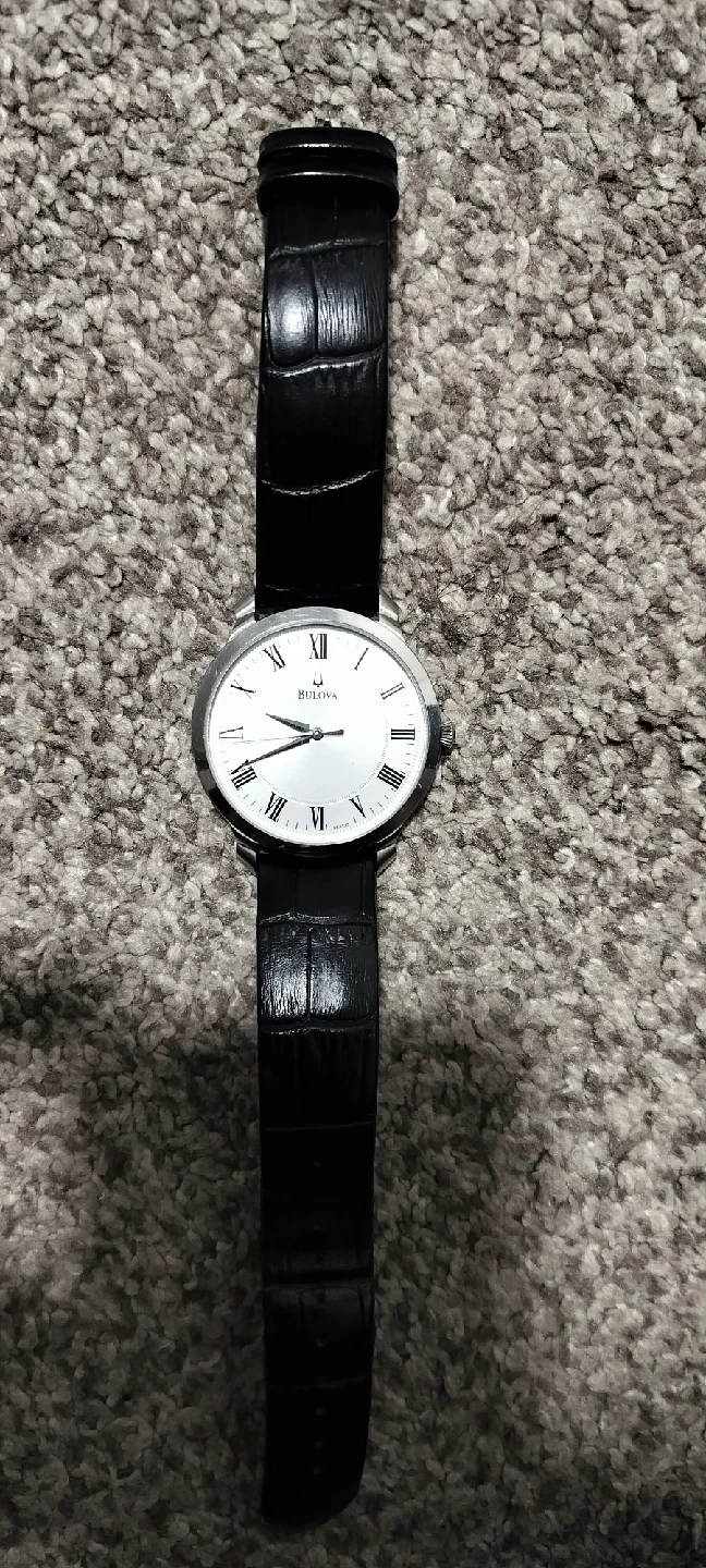 252Selling a Bulova men's watch with a classic black leather band. It features a clean, easy-to-read dial with Roman numerals. The watch is in great condition and would be a stylish addition to any outfit!