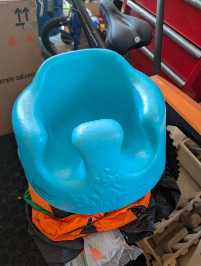 10Get your little one sitting pretty with this used Bumbo floor seat, designed to help babies sit upright. This light blue seat is perfect for supporting your baby as they learn to sit, featuring a contoured shape and safety harness. It has some cosmetic wear, but is in good working order.